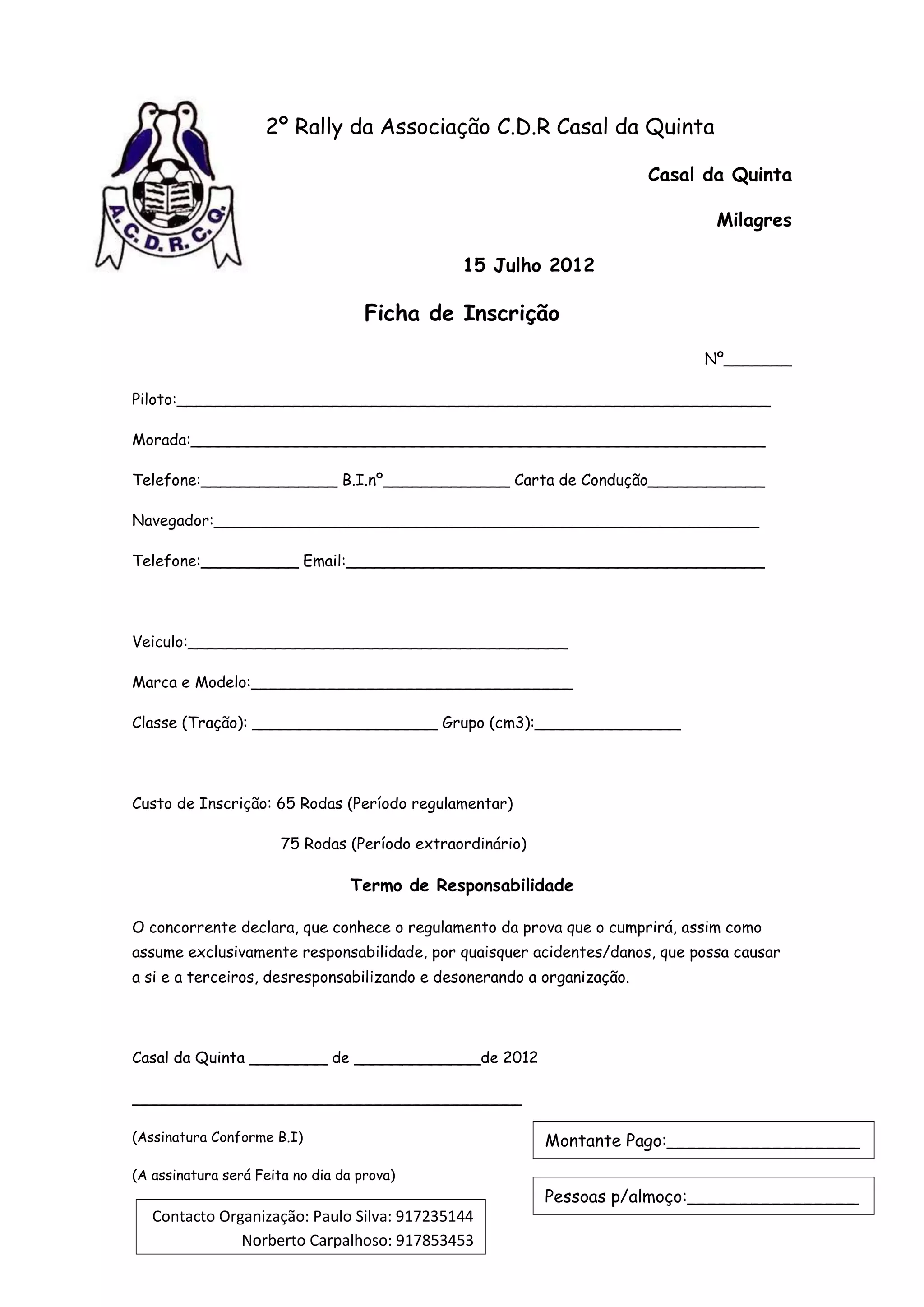 Este documento é uma ficha de inscrição para o 2o Rally da Associação C.D.R Casal da Quinta em 15 de Julho de 2012. Contém seções para preencher os detalhes do piloto, navegador, veículo e pagamento da taxa de inscrição de 65 ou 75 euros dependendo do período. O concorrente deve assinar um termo de responsabilidade assumindo responsabilidade por qualquer acidente.
