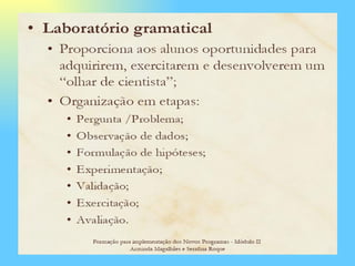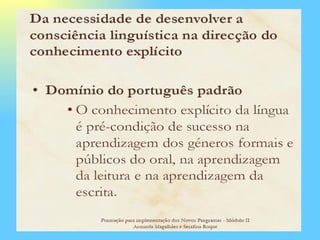 O documento discute a implementação de um novo programa de português para o ensino básico em Portugal. Aborda a importância atribuída a diferentes competências linguísticas, estratégias utilizadas para trabalhar o conhecimento explícito da língua, desafios enfrentados por alunos e professores, e diretrizes para organizar o conteúdo de forma progressiva ao longo dos ciclos de ensino.