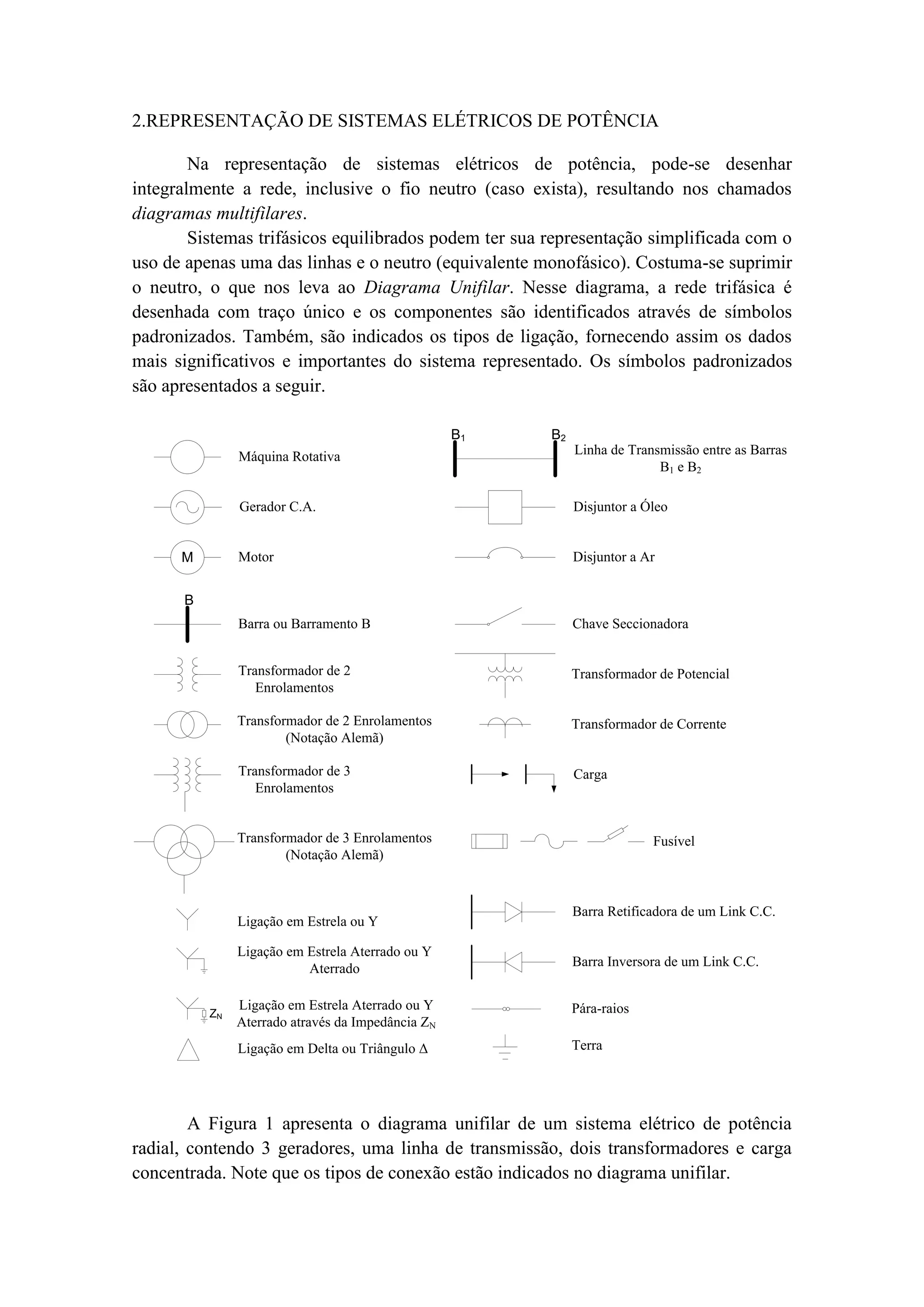 O documento descreve a representação de sistemas elétricos de potência por meio de diagramas unifilares e de impedância. Apresenta os modelos simplificados usados para geradores, transformadores e linhas de transmissão em cálculos de curto-circuito, incluindo a omissão de cargas. Fornece exemplos de como obter dados técnicos de equipamentos em per-unit a partir de suas especificações nominais.