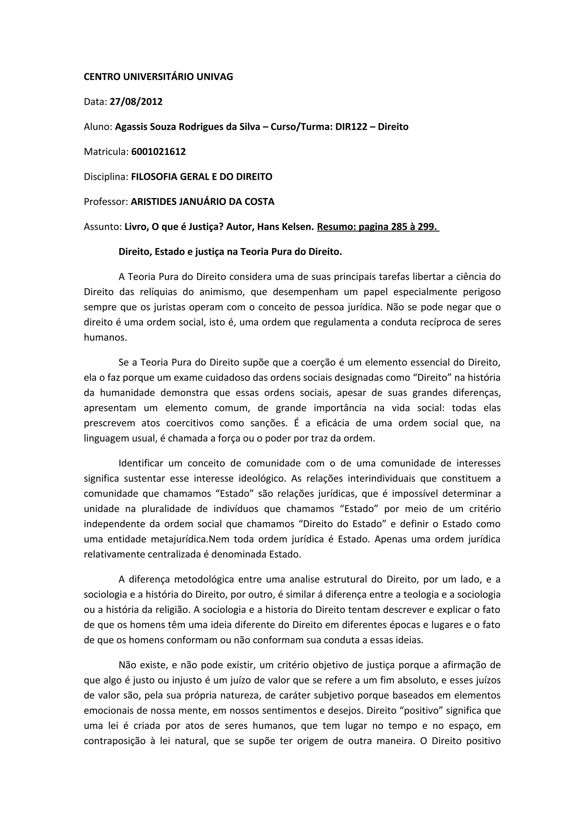 O documento resume os principais pontos da teoria pura do direito de Hans Kelsen sobre direito, estado e justiça. A teoria pura do direito vê o direito como uma ordem social regulada pela coerção. Embora ordens jurídicas variem, todas prescrevem sanções coercitivas. O estado é definido como uma ordem jurídica relativamente centralizada, não como uma entidade metajurídica. Não há critério objetivo de justiça, já que juízos de valor sobre o que é justo ou injusto são subjetivos.