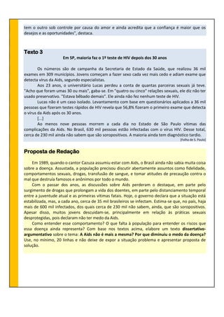 Os três textos descrevem: 1) A história da Aids e o desenvolvimento de tratamentos; 2) Por que os jovens não usam camisinha apesar dos riscos; 3) A maioria faz o primeiro teste de HIV depois dos 30 anos, ignorando os riscos da doença.