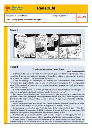 O documento discute o papel do professor na era digital. Argumenta-se que os professores precisam se adaptar às novas tecnologias e usá-las de forma pedagógica para enriquecer o aprendizado. Também defende que os professores devem ser mediadores entre os alunos e a informação online, guiando-os na pesquisa e discussão de temas.