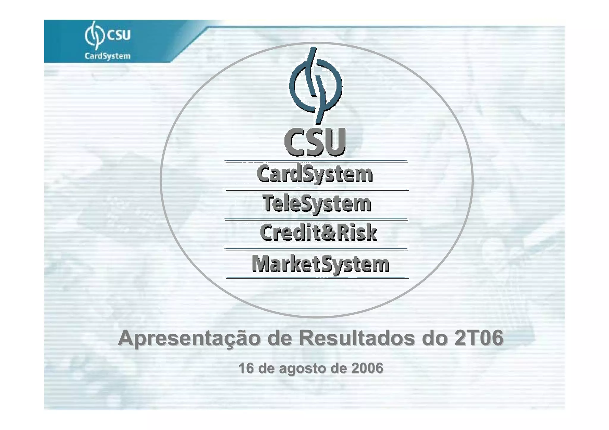 O documento apresenta os resultados financeiros da empresa no 2T06, com crescimento de receita bruta em comparação com o 2T05. A margem EBITDA ficou estável em relação ao trimestre anterior, apesar do aumento de custos de produção. As principais ações estratégicas para 2006 incluem a ampliação de participação de mercado nas unidades de cartões e mercado, bem como aumento de rentabilidade nas unidades de telecomunicações e crédito e riscos.