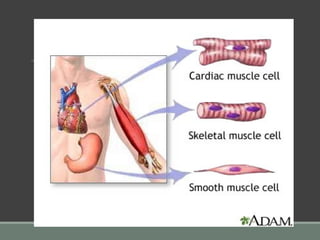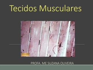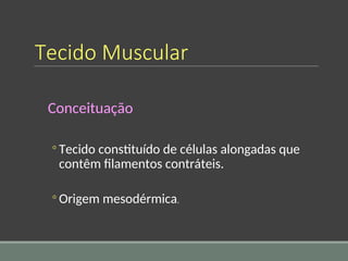 O tecido muscular é composto por células alongadas especializadas na contração, com origens mesodérmicas. Ele é classificado em três tipos principais: estriado esquelético, cardíaco e liso, cada um com características e funções distintas. A regeneração do tecido varia, sendo o músculo cardíaco incapaz de regenerar, enquanto o músculo esquelético possui uma capacidade limitada e o liso tem uma boa capacidade regenerativa.