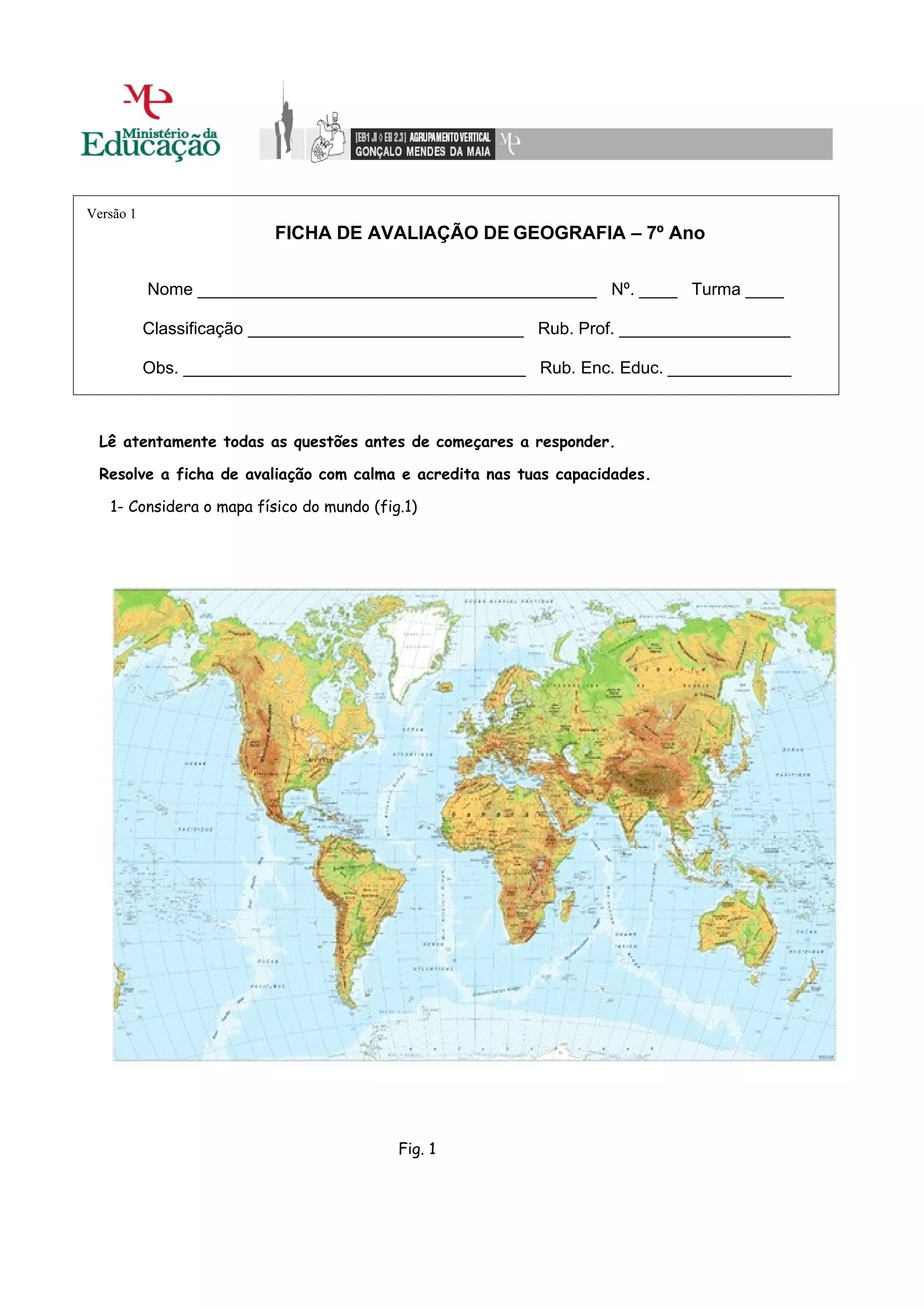 1- Considera o mapa físico do mundo (fig.1)