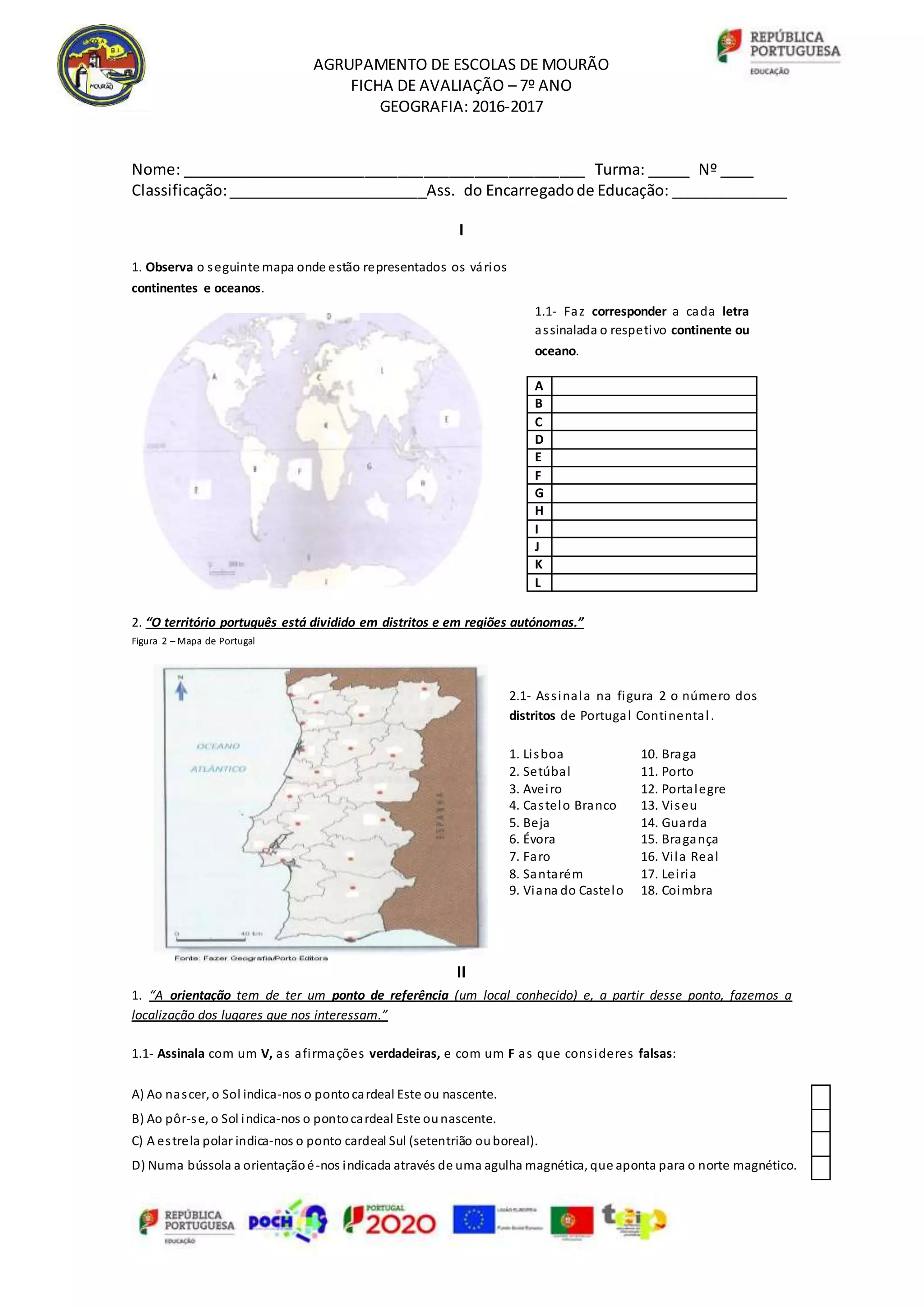 1) O documento apresenta uma ficha de avaliação de Geografia do 7o ano com questões sobre a orientação, continentes, países da Europa e da União Europeia.