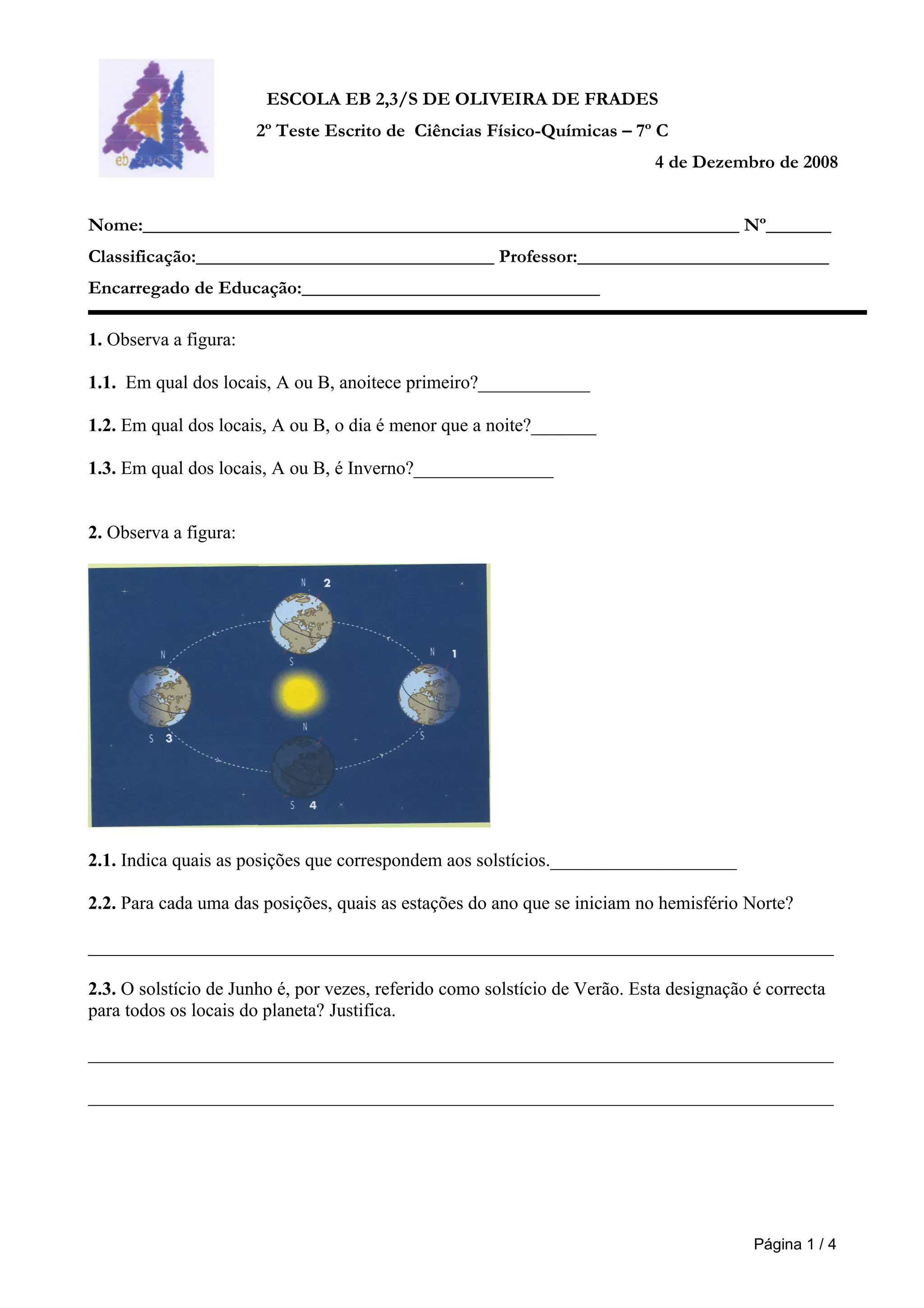 1) O documento contém um teste de Ciências Físico-Químicas com 12 questões sobre corpos celestes e fenômenos astronômicos.