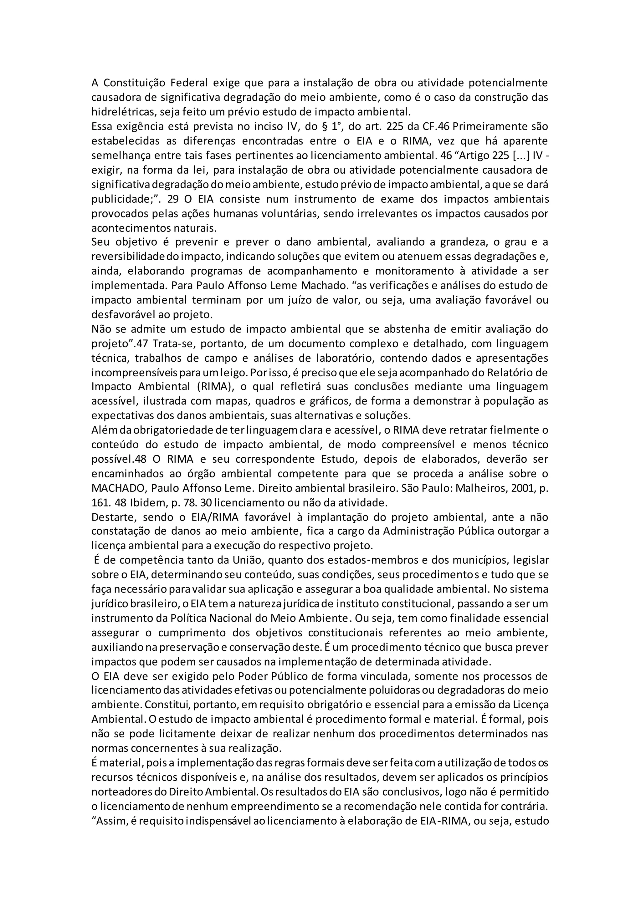 O documento discute a obrigatoriedade de realizar estudos de impacto ambiental (EIA) e relatórios de impacto ambiental (RIMA) para projetos que possam causar degradação ambiental significativa, conforme exigido pela Constituição Federal. O EIA é um estudo técnico complexo enquanto o RIMA resume suas conclusões de forma acessível ao público. Ambos são requisitos essenciais para a emissão de licenças ambientais para novos projetos.