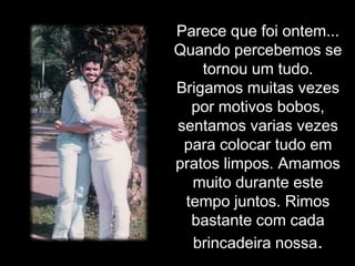 O documento é uma carta de aniversário de casamento de 20 anos de um casal. Eles passaram por altos e baixos, mas seu amor os manteve unidos. Juntos tiveram duas filhas e embora não sejam perfeitos, seu amor supera seus defeitos. A autora agradece a Deus por encontrar seu príncipe e ser feliz ao seu lado.