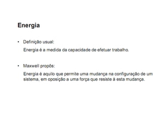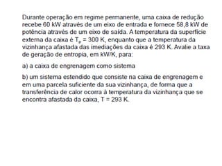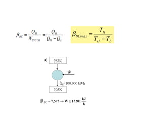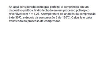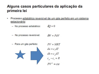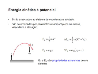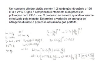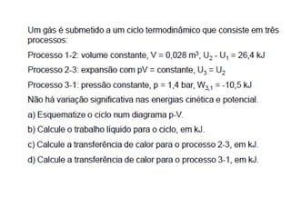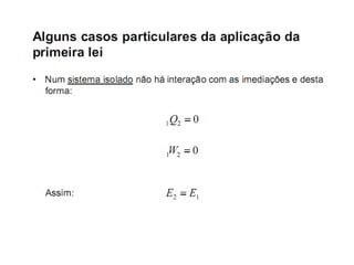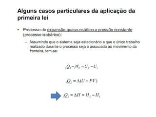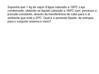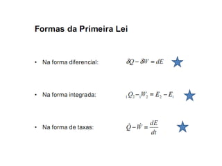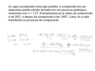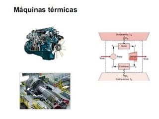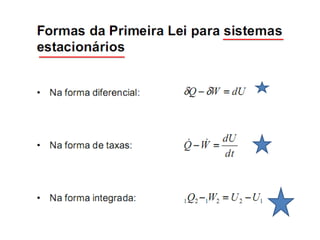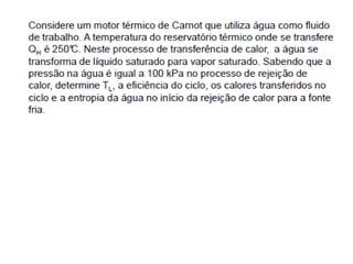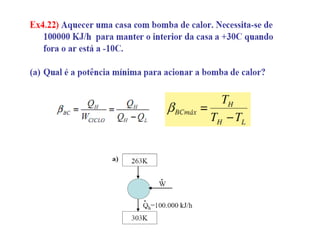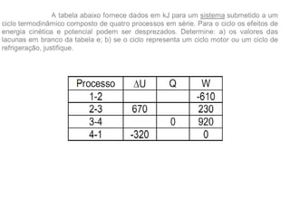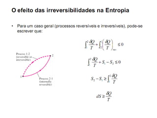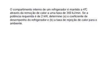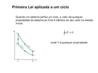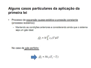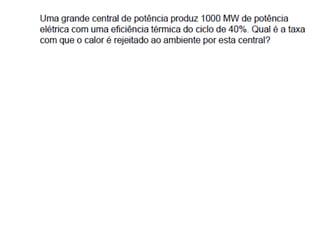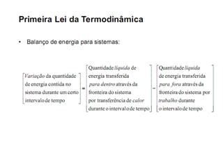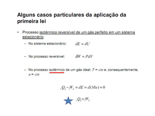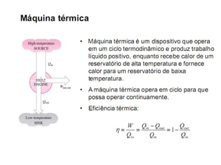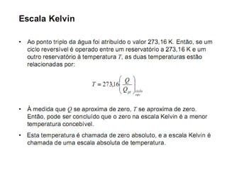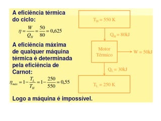 Este documento resume os principais pontos da primeira e segunda lei da termodinâmica, incluindo: a primeira lei trata da conservação de energia em sistemas termodinâmicos, enquanto a segunda lei estabelece que o calor não flui naturalmente de um corpo frio para um quente. O documento também discute processos reversíveis, o ciclo de Carnot, eficácia máxima de máquinas térmicas e a escala Kelvin de temperatura.