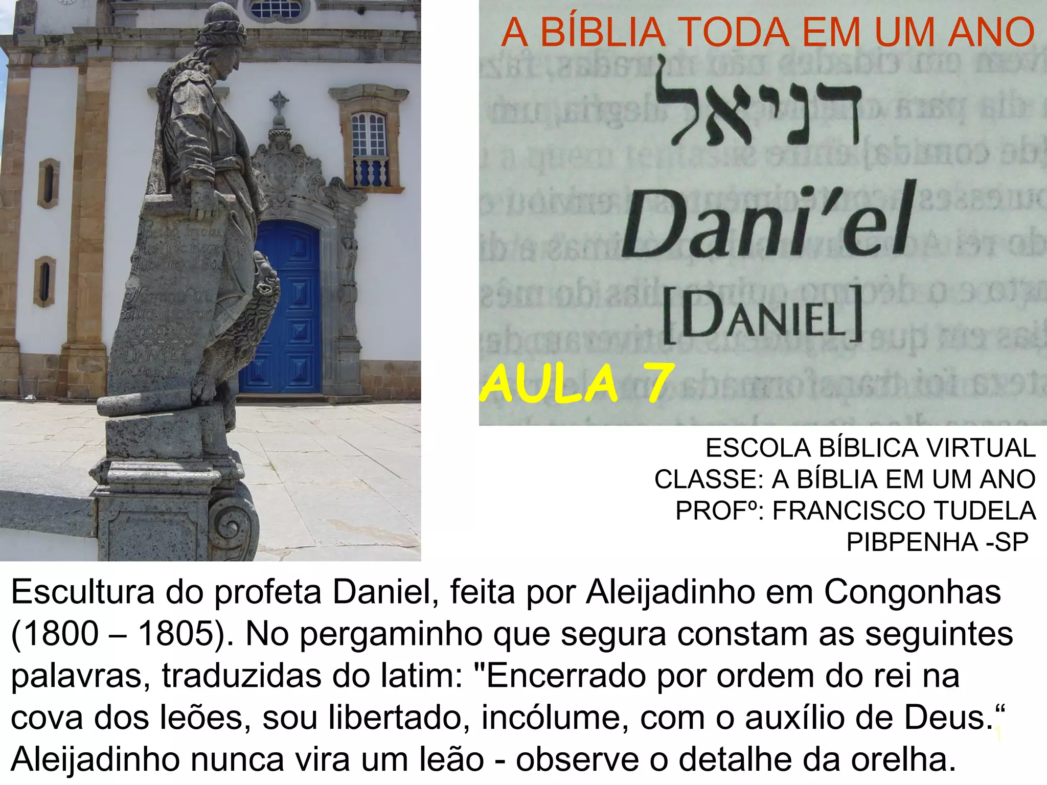 O documento descreve a escultura do profeta Daniel feita por Aleijadinho em Congonhas no século 18. O pergaminho na mão da escultura contém palavras traduzidas do latim referindo-se a Daniel ter sido libertado incólume da cova dos leões com a ajuda de Deus, conforme a história bíblica. O documento também observa que Aleijadinho nunca viu um leão de perto e por isso o detalhe da orelha está incorreto.