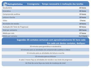 O documento apresenta um plano de estudos semanal para o Nível 1 - Parte 1 de um curso de inglês. Ele sugere a divisão das atividades por semana, com foco em vocabulário, gramática, leitura, escrita, vídeos e revisões. Cada semana concentra-se em uma unidade temática com lições e avaliações a cada dois meses.