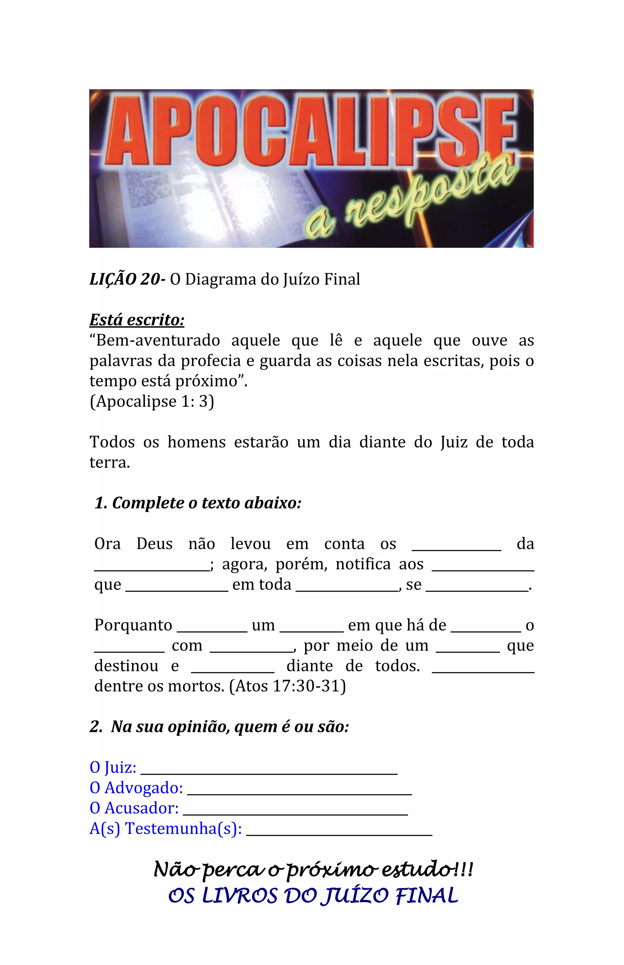 O documento discute o Juízo Final, explicando que todos serão julgados por Deus e que Jesus atua como nosso Advogado. Ele fornece detalhes sobre quem será o Juiz, Advogado, Acusador e Testemunhas no Juízo, e descreve as diferentes fases do processo - Investigação, Comprovação e Execução. O texto convida o leitor a aceitar Jesus como seu Advogado e viver de acordo com os mandamentos de Deus.