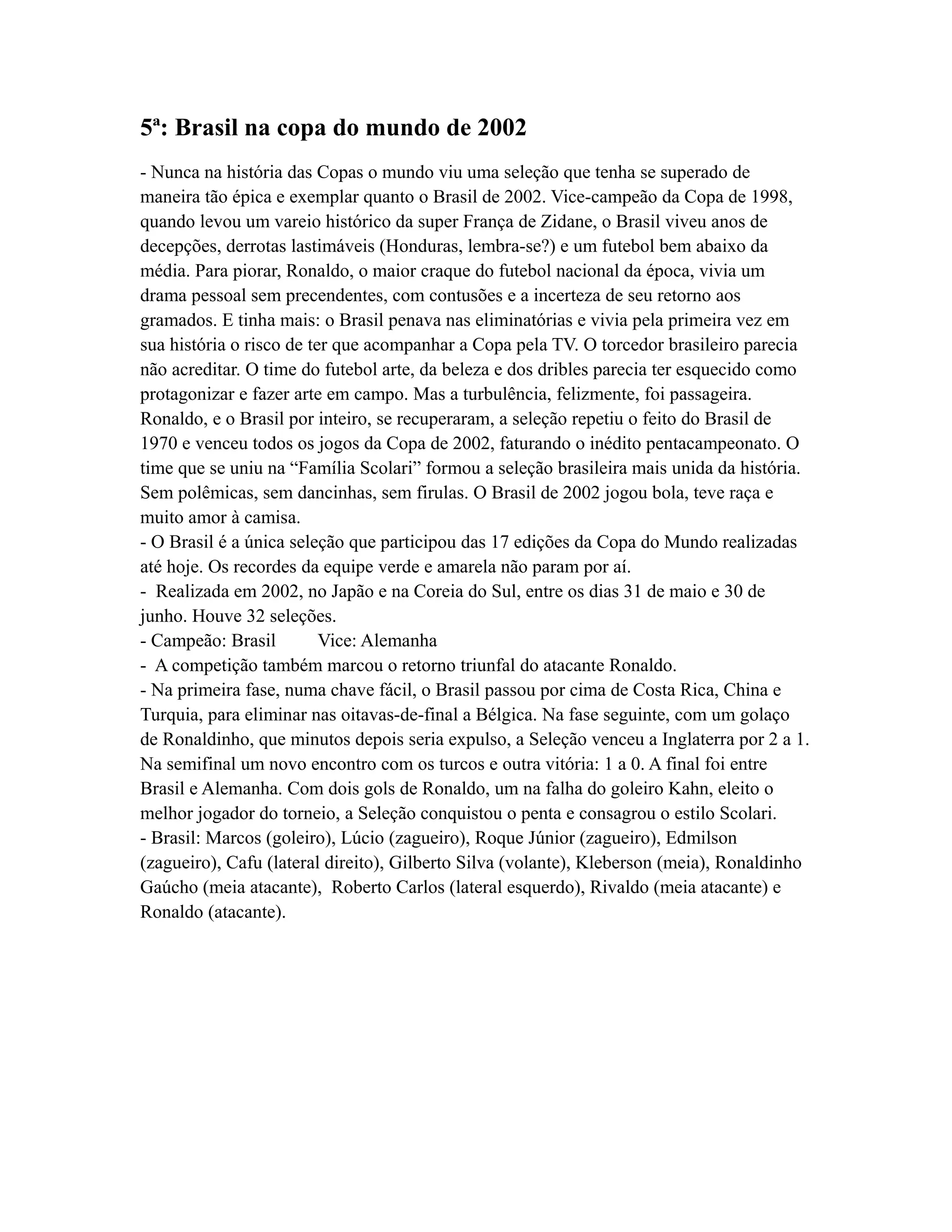 Após anos de decepções, o Brasil se recuperou para vencer a Copa do Mundo de 2002 de forma épica. Liderados por Ronaldo, que retornou de lesões, o Brasil venceu todos os jogos e conquistou seu pentacampeonato de forma invicta, sob o comando do técnico Scolari. Na final, o Brasil derrotou a Alemanha por 2-0 com dois gols de Ronaldo.
