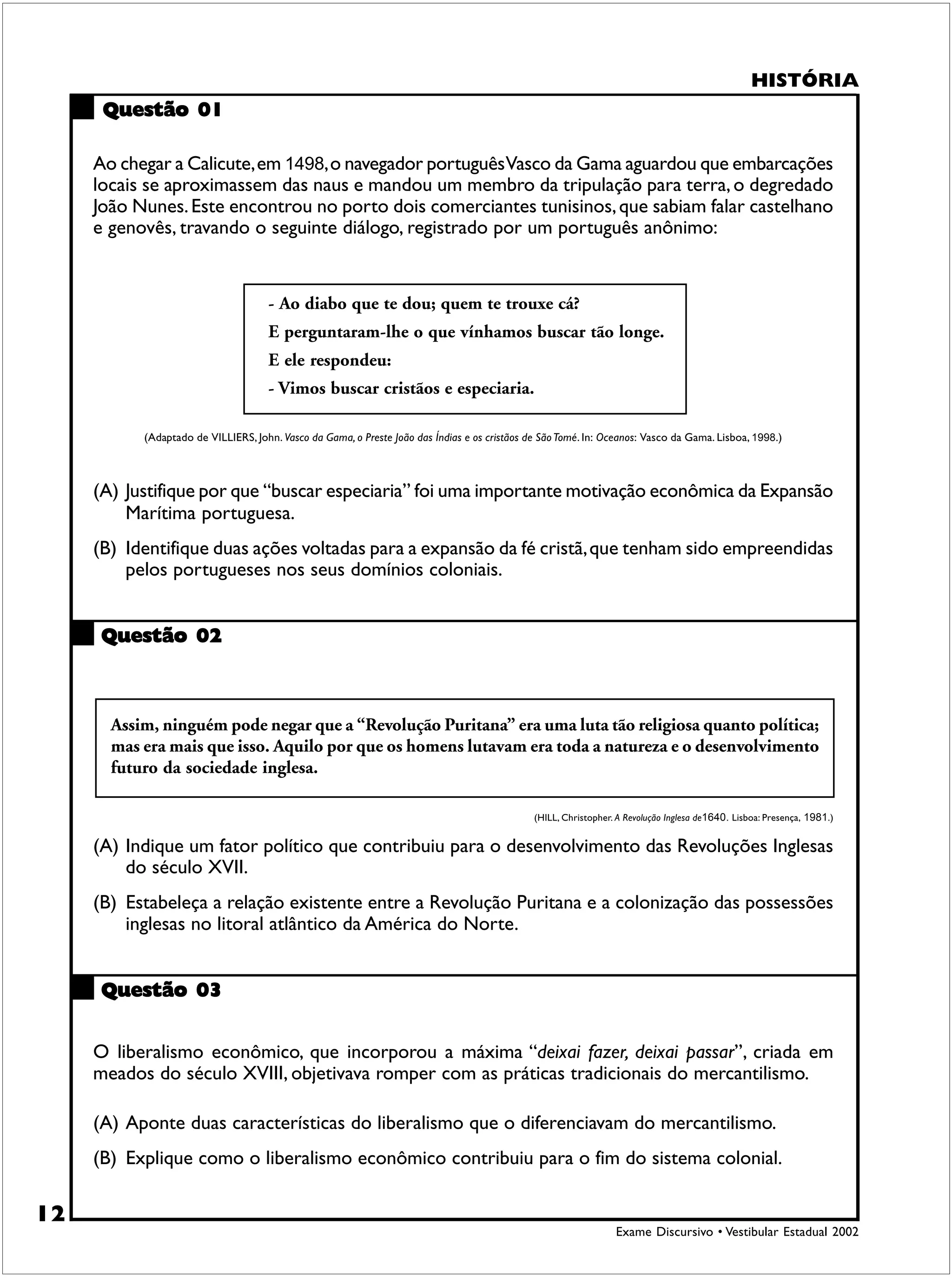 O documento apresenta três questões sobre história. A primeira questão discute as motivações econômicas e religiosas da expansão portuguesa. A segunda questão aborda os fatores políticos e religiosos das revoluções inglesas do século XVII e sua relação com as colônias americanas. A terceira questão compara o liberalismo econômico e o mercantilismo e como o primeiro contribuiu para o fim do sistema colonial.