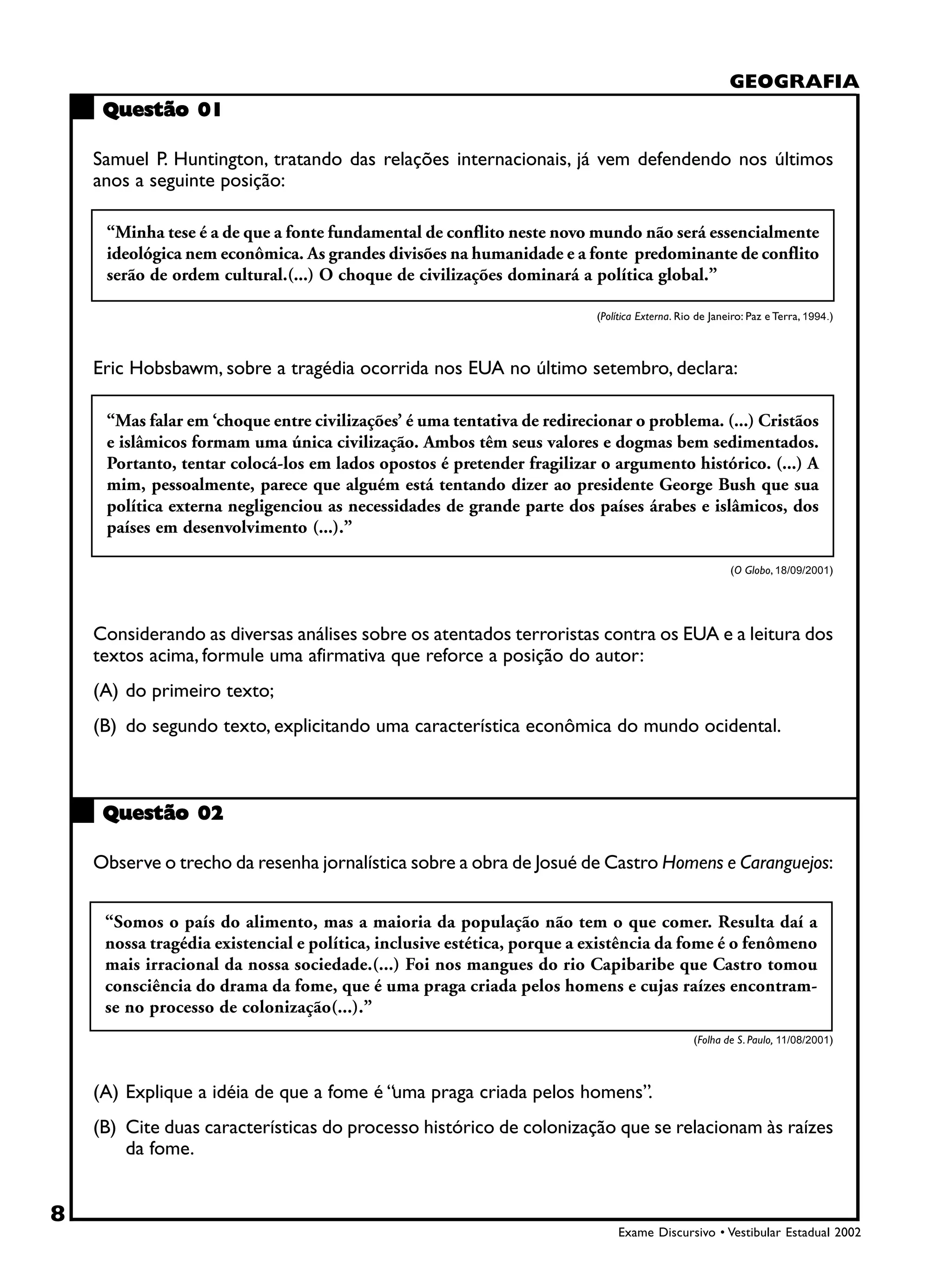 O primeiro texto defende que os conflitos futuros serão motivados por diferenças culturais, não ideológicas ou econômicas. O segundo texto discorda, afirmando que islâmicos e cristãos compartilham uma mesma civilização, e que tentar colocá-los em lados opostos é fragilizar o argumento histórico. O terceiro texto deve reforçar a posição do segundo texto, enfatizando uma característica econômica do mundo ocidental que contribui para os conflitos.