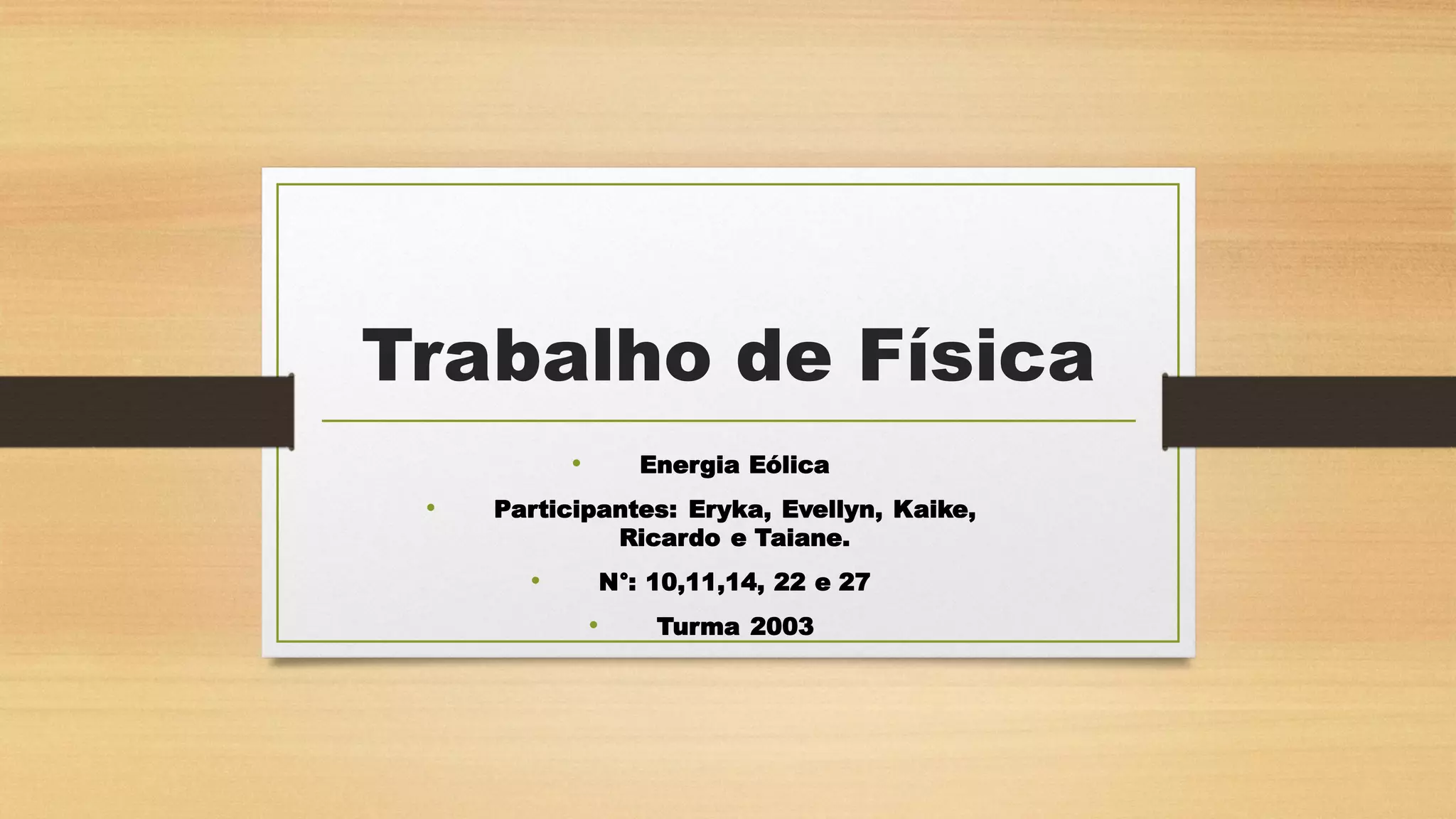 O documento discute energia eólica, incluindo sua definição como energia gerada pelo vento, como turbinas eólicas convertem a energia cinética do vento em eletricidade, e as vantagens e desvantagens de sua produção. O documento também fornece detalhes sobre a produção de energia eólica no Brasil e em outros países.