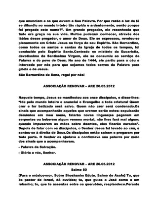 O documento celebra a vida de São Bernardino de Sena, enfatizando sua dedicação à pregação e à vivência dos ensinamentos cristãos, além de destacar a importância da reforma íntima guiada pela vontade de Deus. Inclui elementos de fé e oração, convidando os leitores a se unirem em devoção e a reconhecerem o poder da oração e do nome de Jesus. O texto também fala sobre a necessidade de doações para sustentar a missão da Associação Renovar.