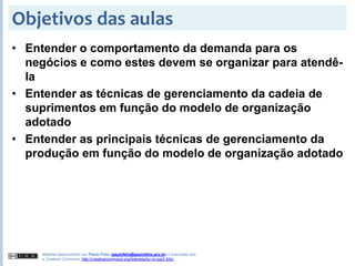 As aulas abordam o gerenciamento da oferta e demanda, cobrindo como as empresas devem se organizar para atender a demanda dos clientes, as técnicas de gerenciamento da cadeia de suprimentos de acordo com o modelo de organização adotado e as principais técnicas de gerenciamento da produção em função do modelo organizacional.