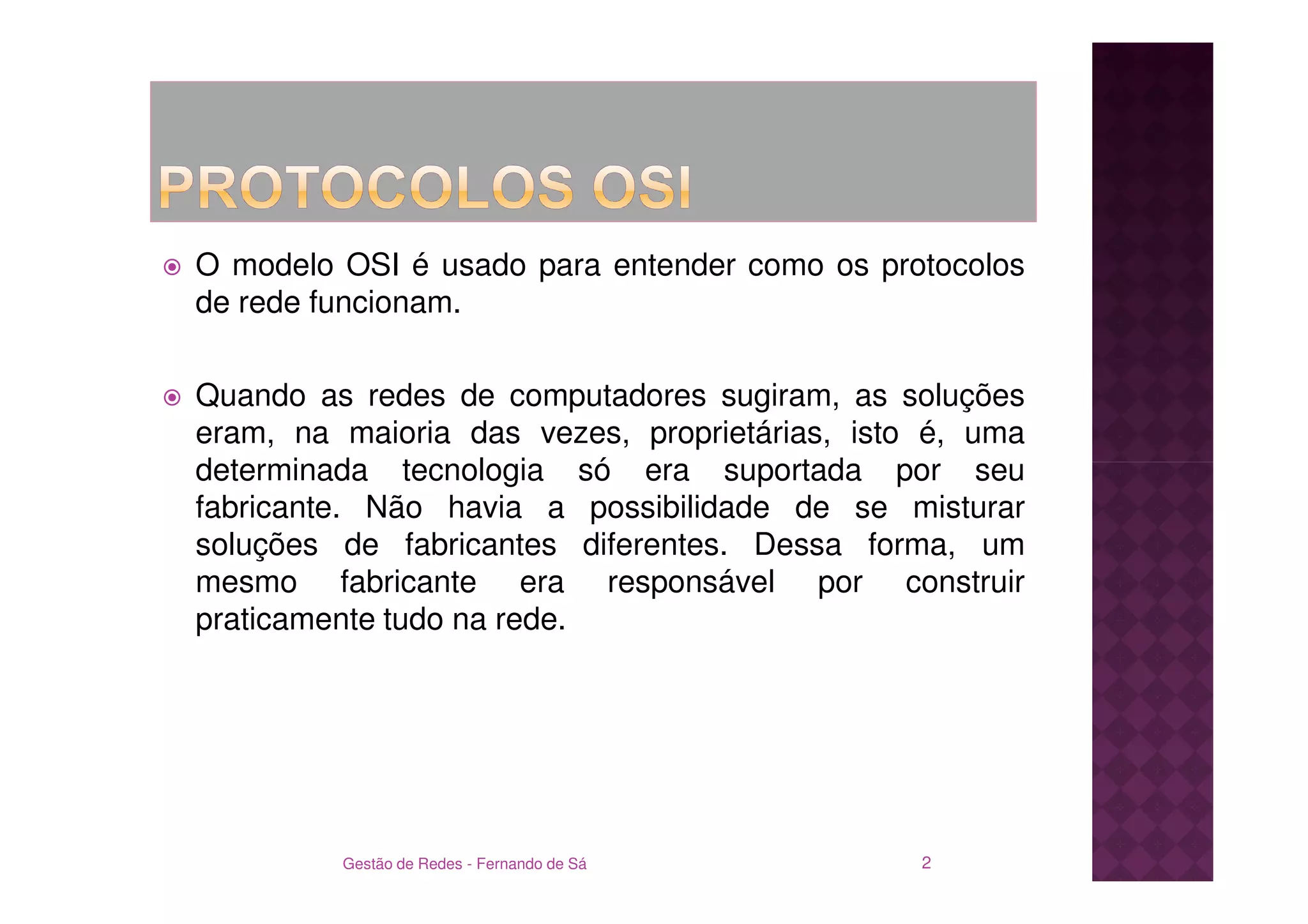 O documento discute o modelo OSI, que é usado para entender como os protocolos de rede funcionam. O modelo OSI padroniza a ordem como os protocolos processam dados na pilha de protocolos, permitindo a compatibilidade entre protocolos diferentes. O modelo OSI consiste em sete camadas, cada uma responsável por um tipo específico de processamento de dados na rede.
