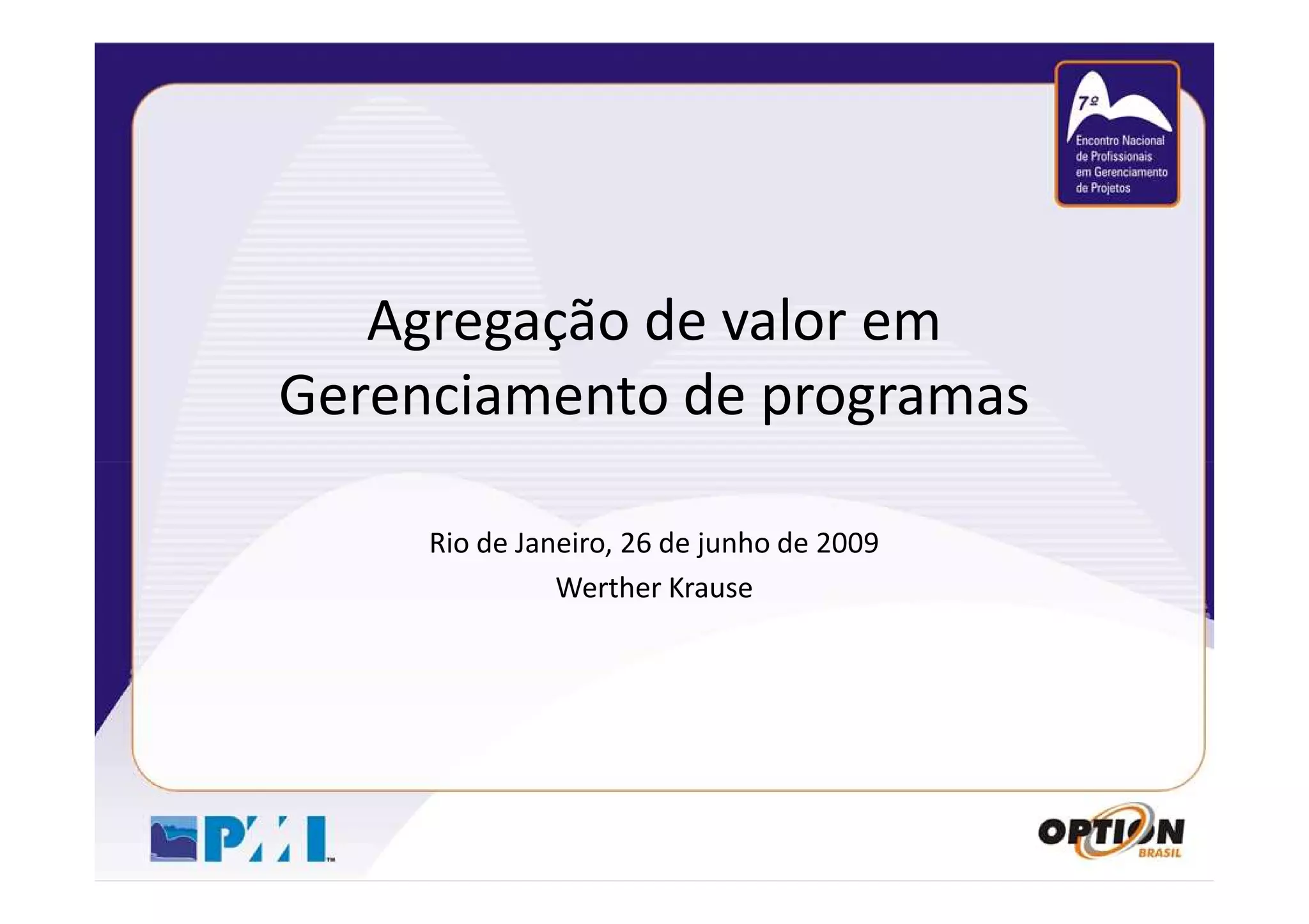 Este documento discute a importância da agregação de valor no gerenciamento de programas. Ele resume as principais práticas de mercado e propõe uma abordagem orientada a agregação de valor por meio de decisões baseadas no negócio, visão sistêmica, cultura colaborativa, gestão de mudanças e governança alinhada aos objetivos estratégicos.