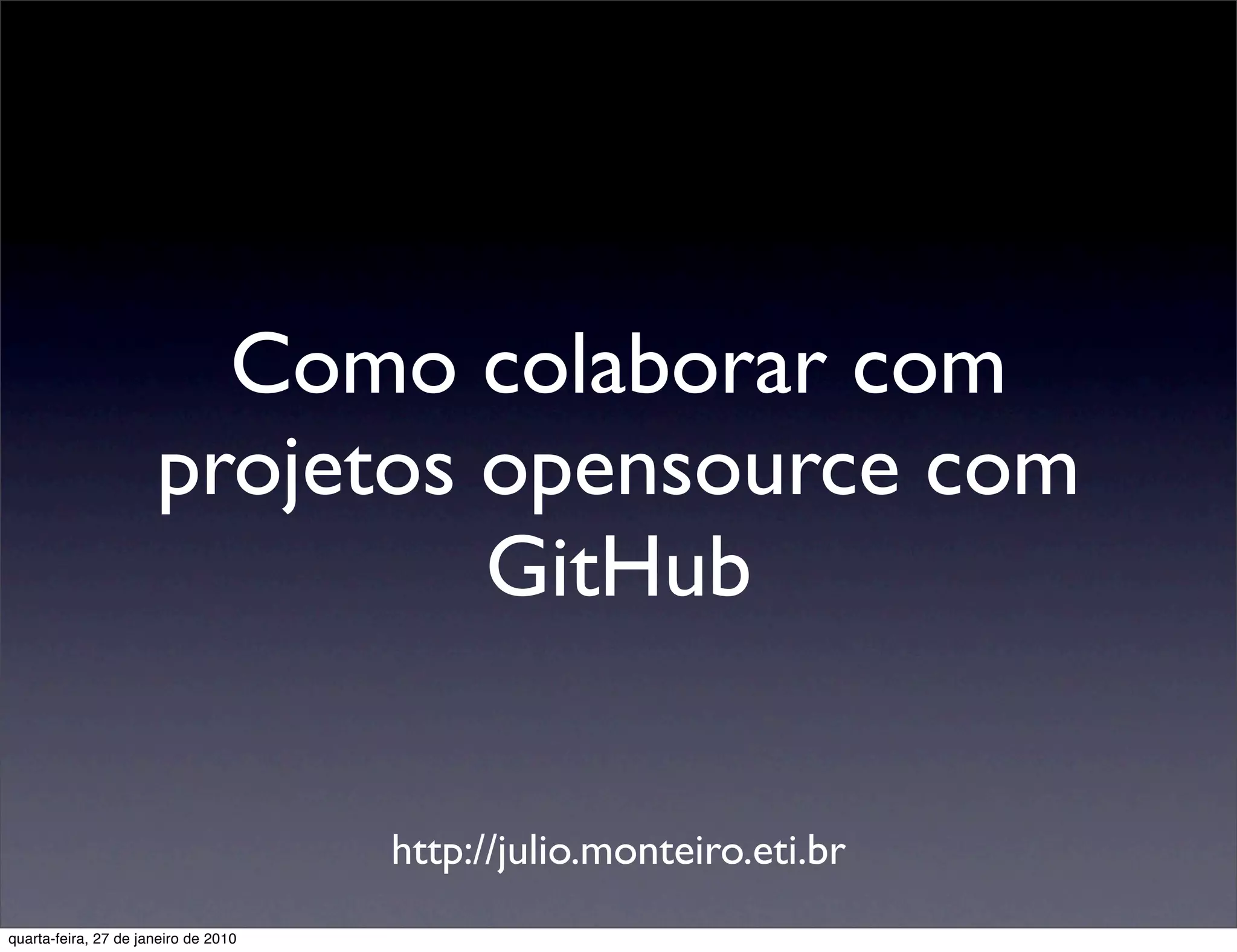 O documento discute como contribuir para projetos de código aberto usando o GitHub. Ele explica o que é o Git e o GitHub, como o fluxo de trabalho funciona e como encontrar projetos para contribuir. É fornecido um passo a passo para começar a contribuir com links para recursos adicionais de aprendizagem sobre o Git e o GitHub.