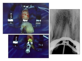 O documento descreve dois casos de tratamento de dentes com fraturas coronárias. No primeiro caso, um dente sofreu trauma há um ano e apresentava mobilidade e sensibilidade. Foi realizada cirurgia para remover o fragmento quebrado e congelar a coroa, e um aparelho ortodôntico foi usado para extruir a raiz e colar a coroa de volta. No segundo caso, um dente com rizogênese incompleta sofreu trauma e teve o fragmento removido, com a polpa mantendo vitalidade. Uma polpot