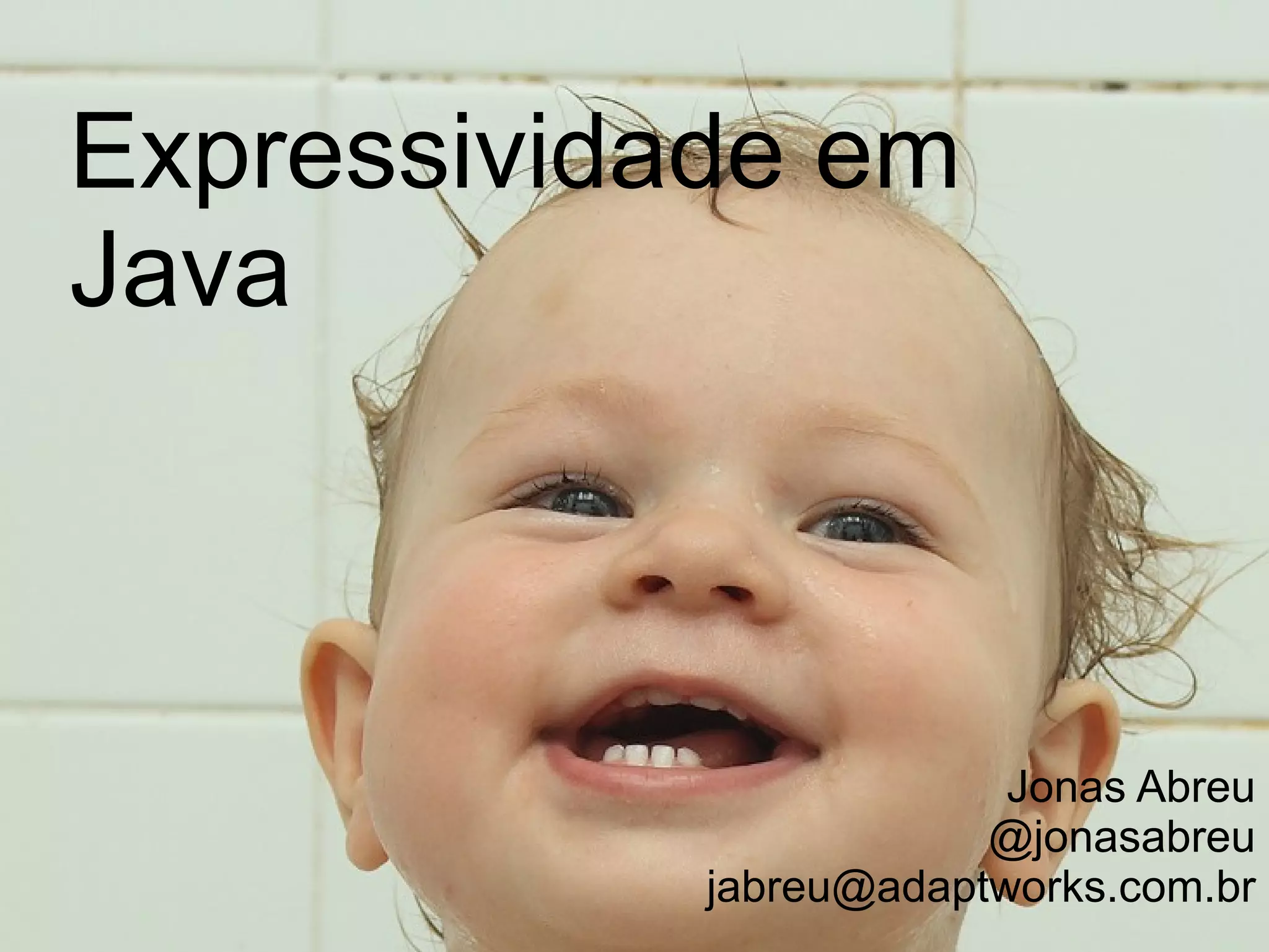 Jonas Abreu discute expressividade em Java, apoiando o site procurandocursos.com e mencionando tiny types, design patterns e DSL como tópicos relevantes.
