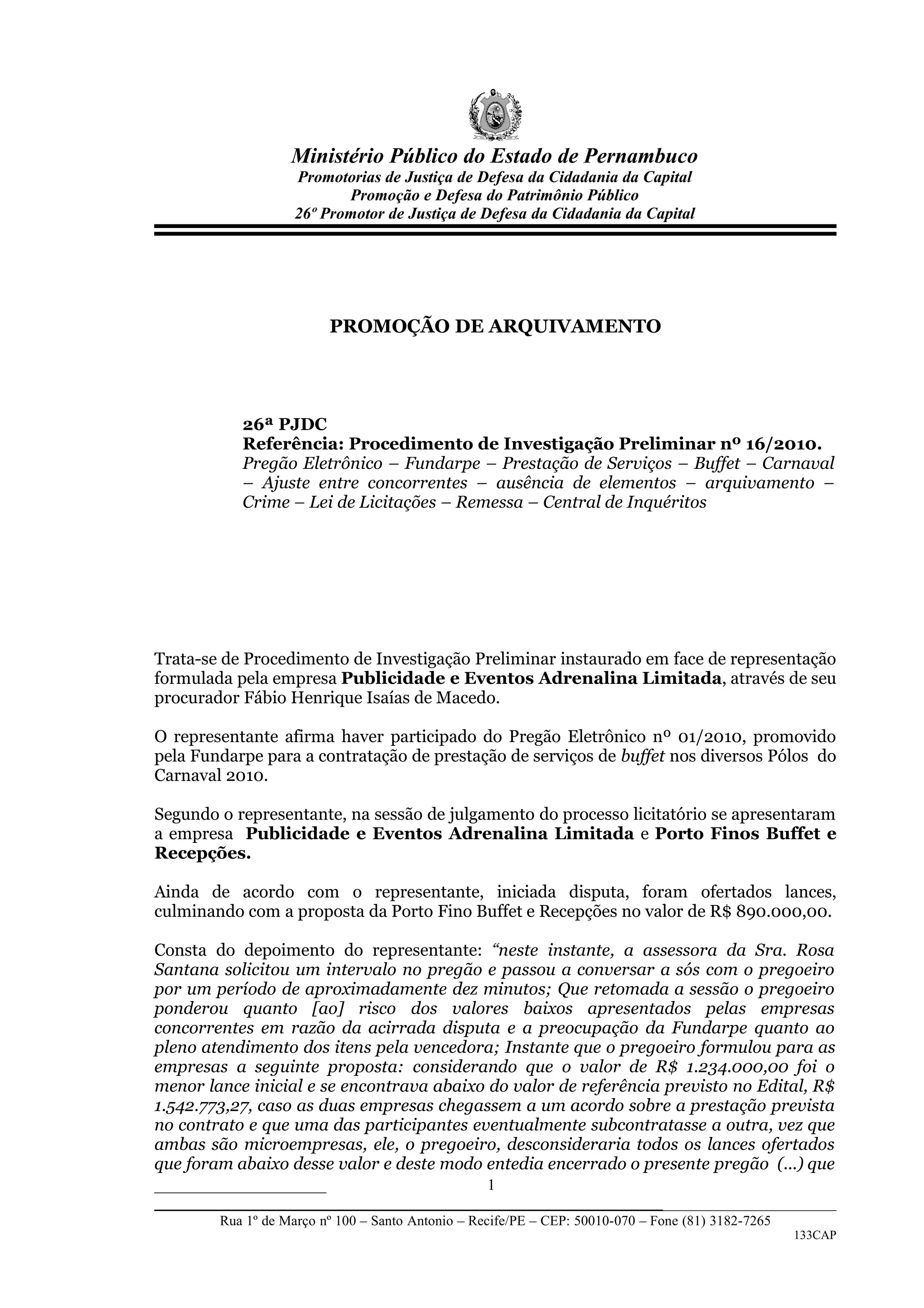 O documento relata um processo de investigação preliminar sobre suposto ajuste entre empresas em uma licitação realizada pela Fundarpe. O promotor de justiça concluiu que não há elementos suficientes para prosseguir com a investigação sobre improbidade administrativa, mas determinou o envio do caso para apuração de possível crime cometido pelo representante da empresa que fez a denúncia.