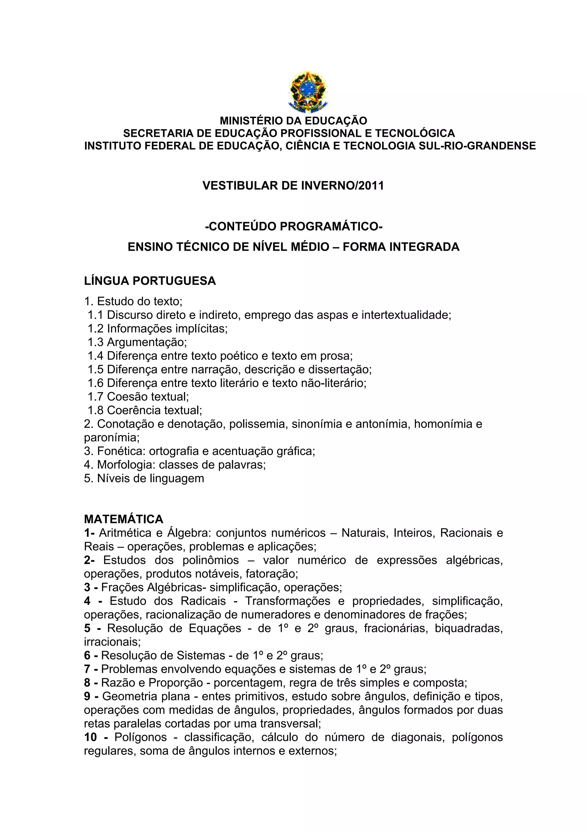 O documento descreve o conteúdo programático para o vestibular de inverno de 2011 do Instituto Federal de Educação, Ciência e Tecnologia Sul-Riograndense para o ensino técnico de nível médio integrado. Apresenta os tópicos a serem cobrados nas provas de Língua Portuguesa, Matemática, História e Geografia, incluindo estudos de texto, gramática, álgebra, geometria, pré-história, civilizações antigas, Idade Média, Moderna e Contemporânea, coorden