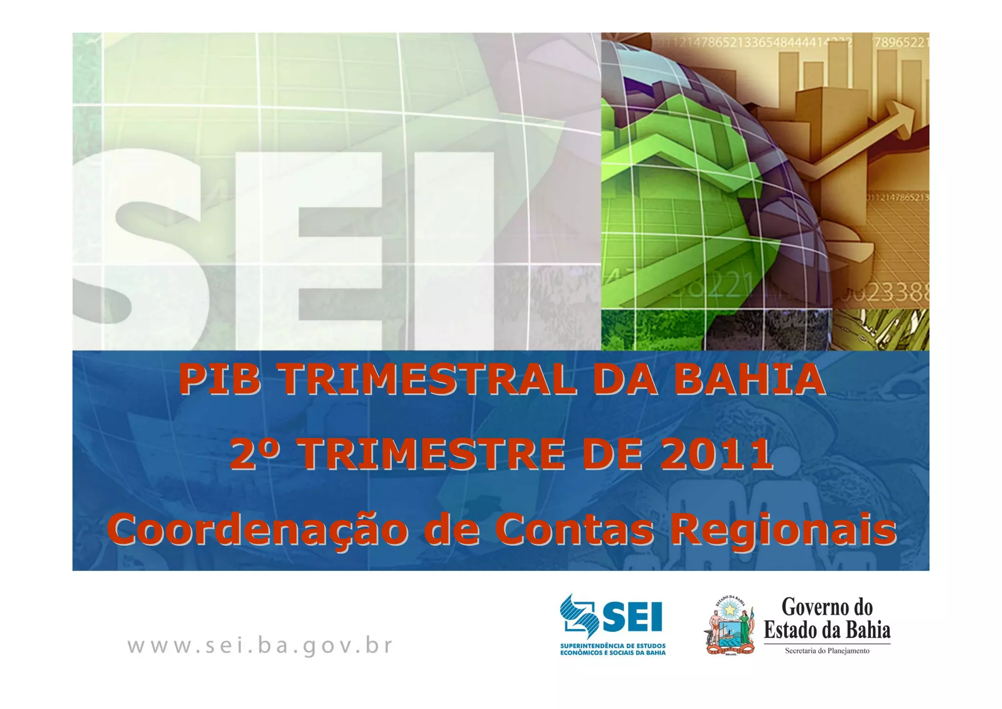 O documento resume os principais indicadores econômicos da Bahia no 2o trimestre de 2011, mostrando crescimento de 2,9% no PIB em relação ao mesmo período do ano anterior, com destaque para o desempenho do setor agropecuário. Apresenta também dados sobre emprego formal, arrecadação de ICMS, produção agrícola, comércio varejista, indústria, comércio exterior e inflação.