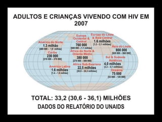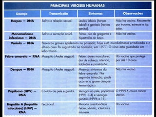 O documento lista várias viroses e doenças infecciosas como sarampo, resfriado, gripe, rubéola, caxumba, hepatite A, B e C, raiva, poliomielite, herpes, febre amarela e dengue. Também discute síndrome, imunodeficiência adquirida e o número de crianças vivendo com AIDS no mundo entre 1990-2007.