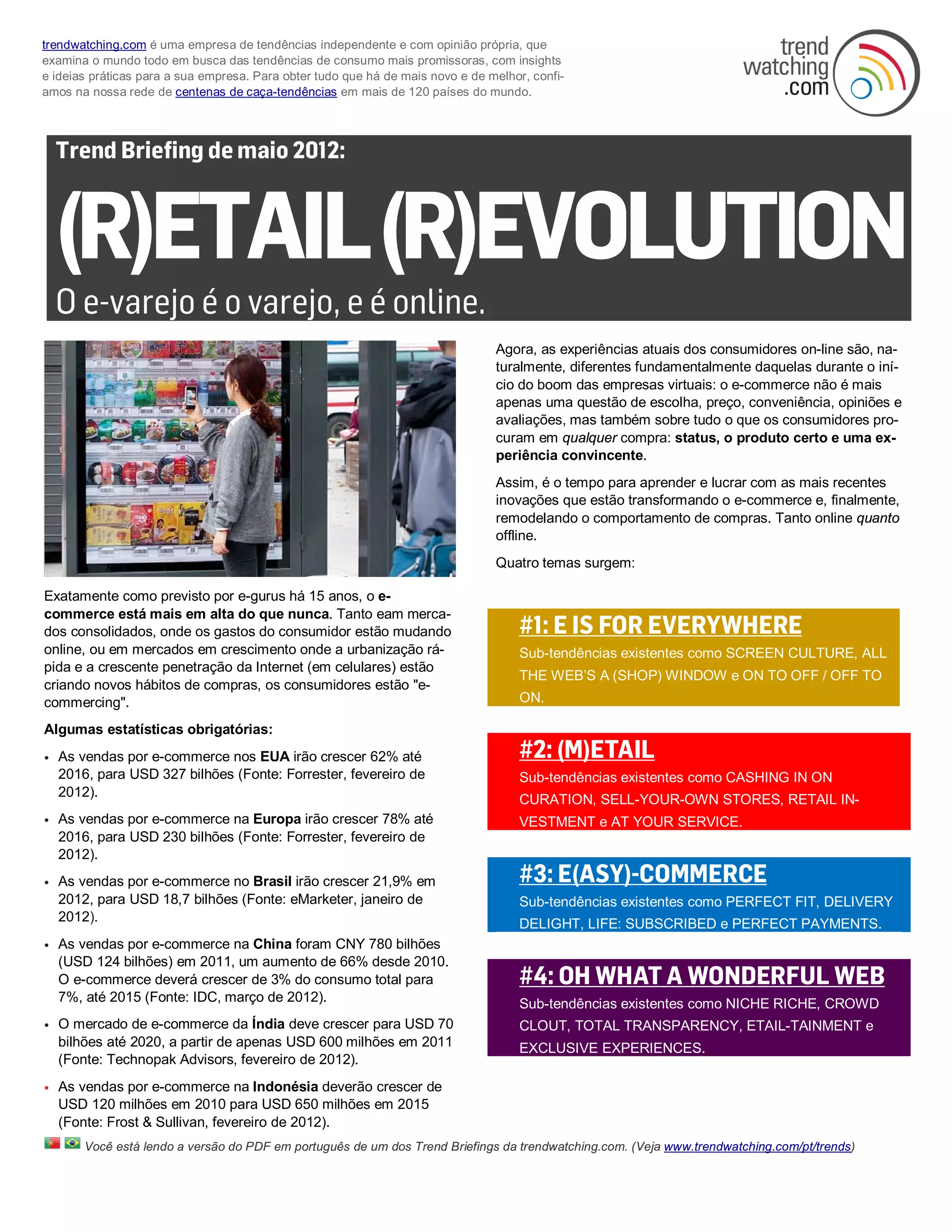 O documento discute as tendências do comércio eletrônico e como as empresas podem se adaptar a elas. Em três pontos: 1) O comércio eletrônico está em toda parte, com compras possíveis em qualquer tela e local; 2) Lojas online estão abrindo lojas físicas e lojas físicas estão se tornando mais digitais; 3) Consumidores esperam encontrar marcas online também no mundo físico.