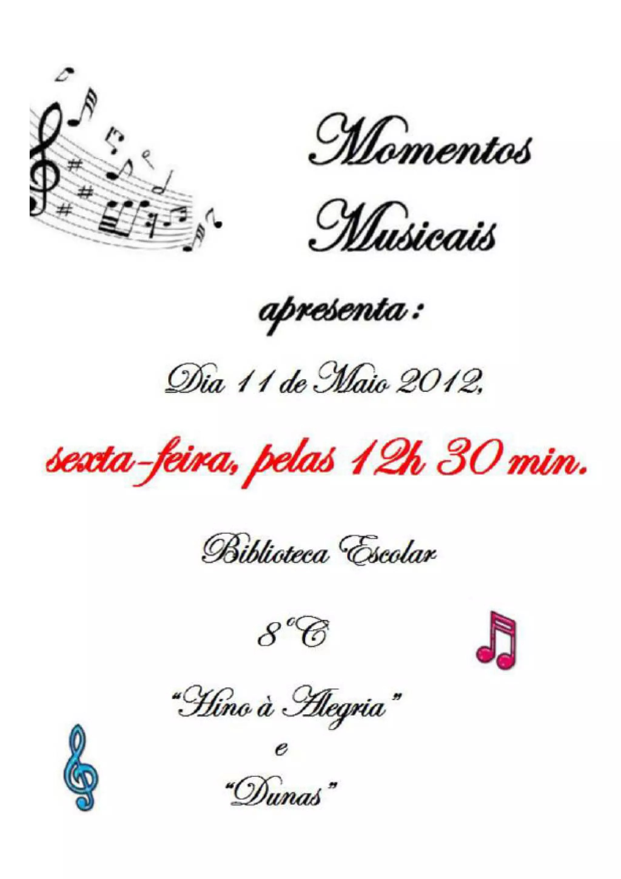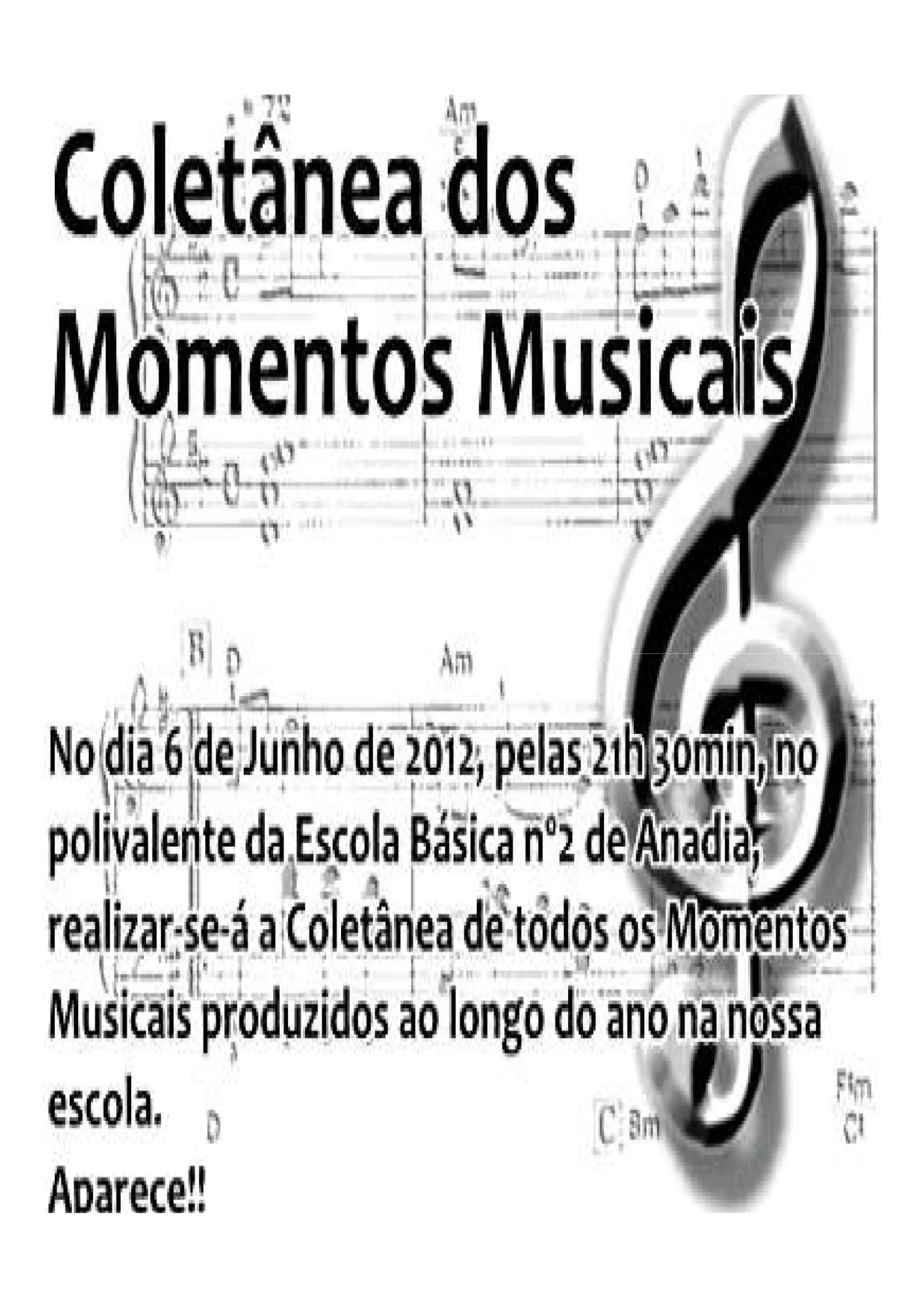 Os alunos da Escola Básica no 2 de Anadia apresentaram seus talentos musicais durante o ano letivo nos Momentos Musicais na biblioteca escolar. Hoje, esses momentos musicais serão culminados em um espetáculo chamado "Coletânea dos Momentos Musicais" no Polivalente da escola, onde os alunos irão se apresentar e entreter a audiência.