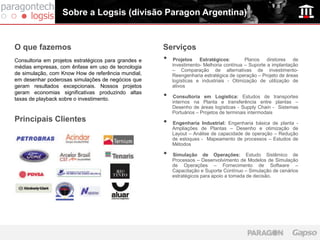 O documento descreve o SimGruas, uma ferramenta de simulação de pontes rolantes que resolve desafios de colisão. O SimGruas está disponível em templates para Arena e Simio e permite modelar com precisão o comportamento real de múltiplas pontes em uma nave de forma genérica para diferentes indústrias. A ferramenta traz benefícios como otimização de investimentos em pontes rolantes e criação rápida de modelos complexos.