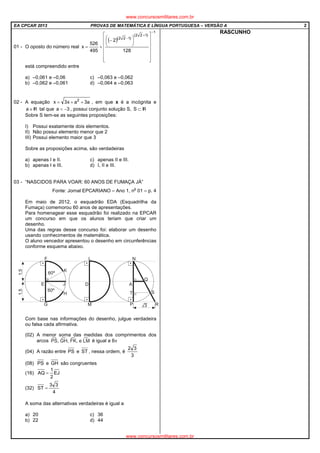 O documento apresenta instruções para a realização de uma prova de admissão ao 1o ano do CPCAR, contendo questões de Matemática e Língua Portuguesa. As instruções incluem informações sobre o número e tipo de questões, critérios de aprovação, tempo de duração da prova e regras que devem ser seguidas pelos candidatos durante a realização da mesma.