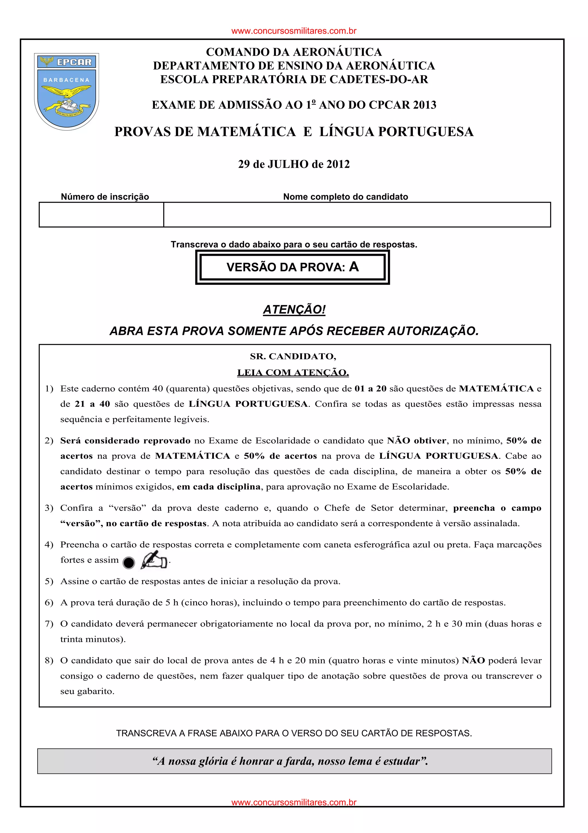 O documento apresenta instruções para a realização de uma prova de admissão ao 1o ano do CPCAR em 2013, contendo questões de Matemática e Língua Portuguesa. São fornecidas informações sobre o número de questões, a duração da prova, a necessidade de assinar o cartão de respostas e transcrição de uma frase no verso do cartão.
