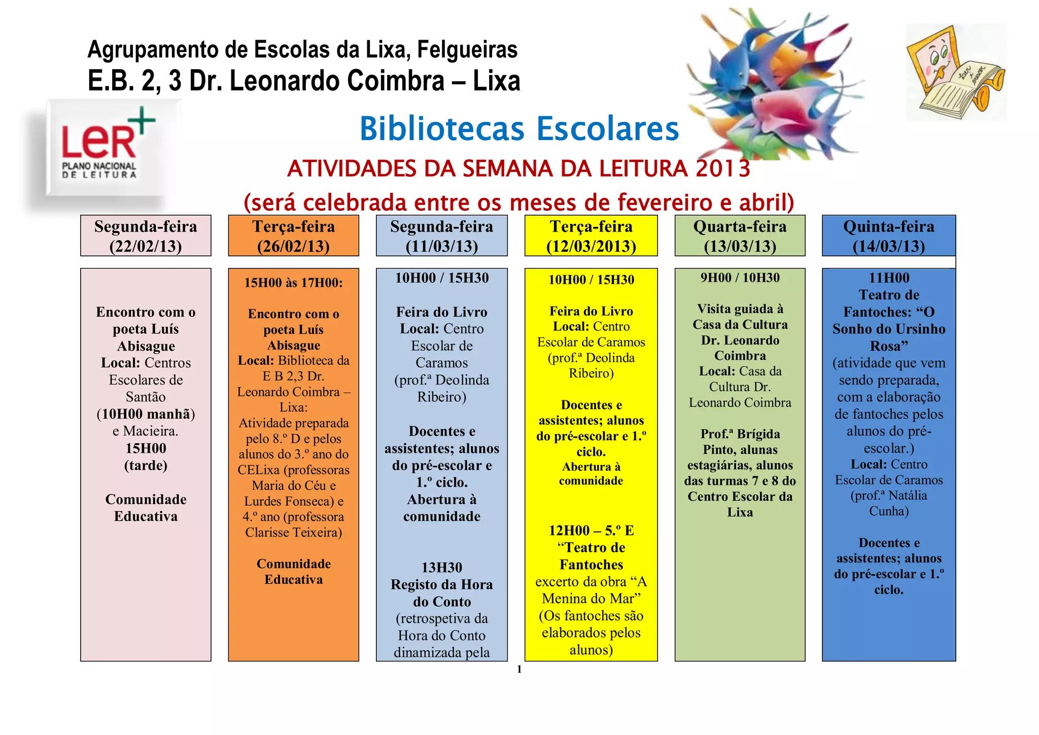Este documento apresenta as atividades planeadas para a Semana da Leitura 2013 nas escolas da Lixa, entre fevereiro e abril, incluindo encontros com autores, feiras do livro, teatro de fantoches, contos, poesia e outras atividades relacionadas com a promoção da leitura.