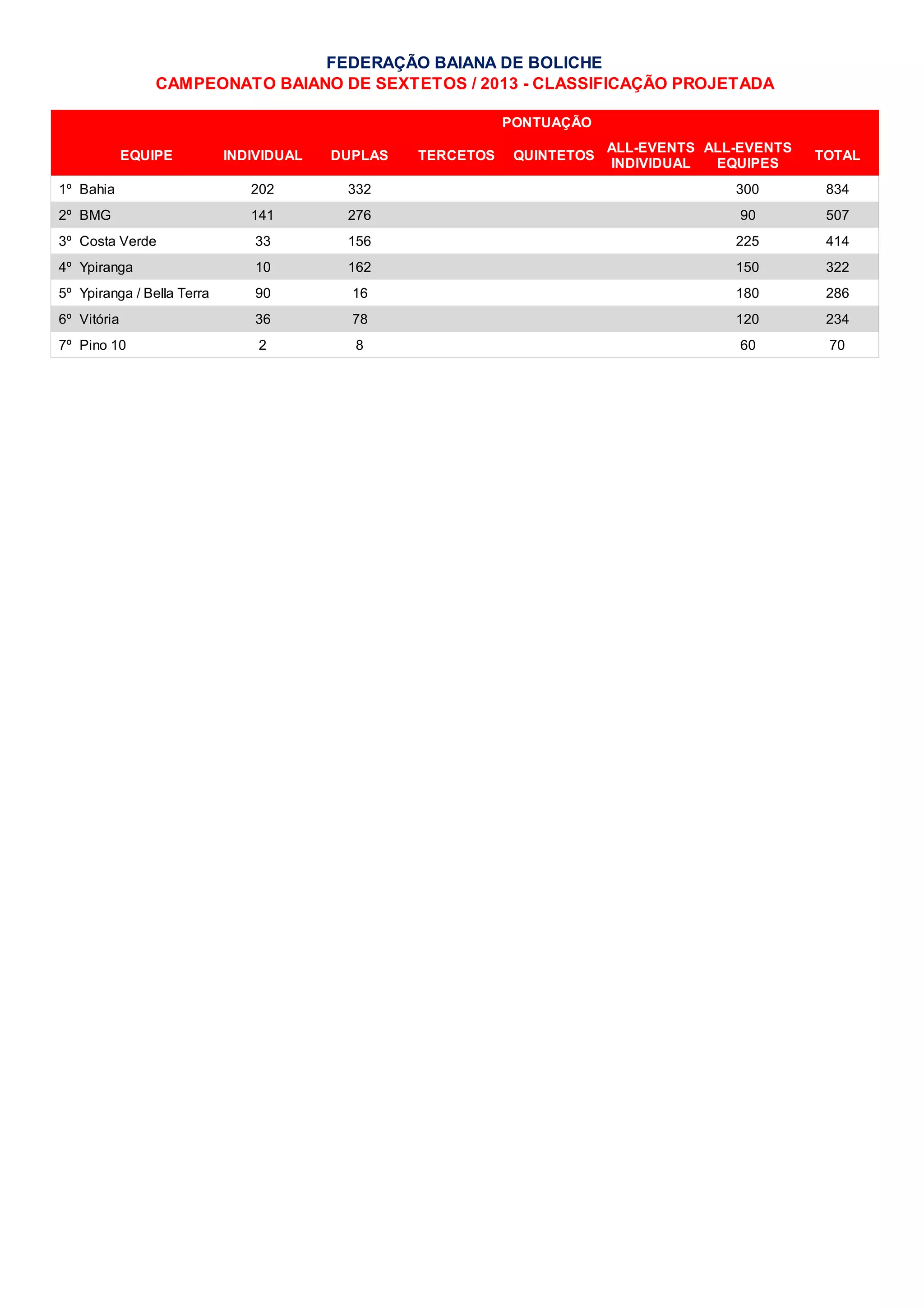 A Federação Baiana de Boliche divulgou a classificação projetada do Campeonato Baiano de Sextetos de 2013, liderada pela equipe do Bahia com um total de 834 pontos, seguida pelo BMG com 507 pontos e pela Costa Verde com 414 pontos.