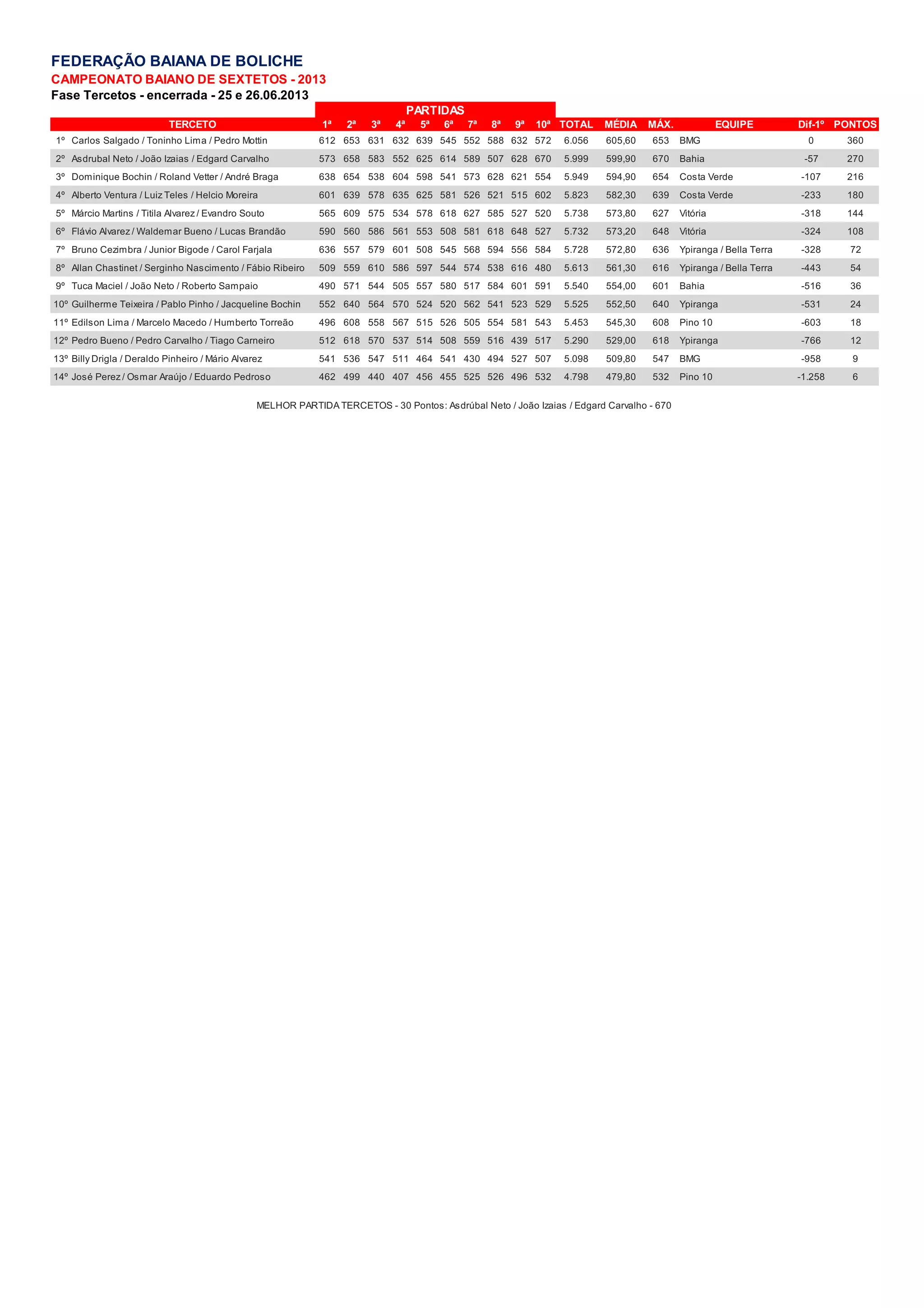 O documento descreve os resultados da fase de tercetos do Campeonato Baiano de Boliche de 2013. O terceto de Carlos Salgado, Toninho Lima e Pedro Mottin terminou em primeiro lugar com uma média de 605,60. O segundo lugar foi para o terceto de Asdrubal Neto, João Izaias e Edgard Carvalho com média de 599,90. A melhor partida foi de 670 pontos feita pelo terceto de Asdrubal Neto, João Izaias e Edgard Carvalho.