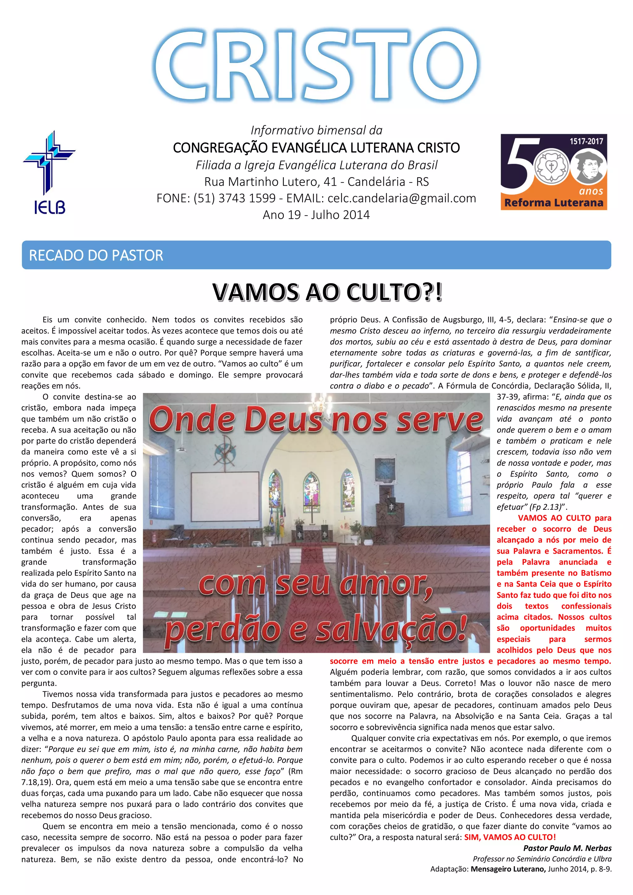 O documento discute o convite para ir ao culto e o que os cristãos podem esperar encontrar nele. (1) Os cristãos têm uma vida transformada, mas ainda lutam contra o pecado. (2) No culto, recebem o socorro de Deus por meio da Palavra e dos sacramentos para vencer a tensão entre a velha e nova natureza. (3) Portanto, o convite ao culto oferece a oportunidade de ser acolhido e consolado por um Deus misericordioso.