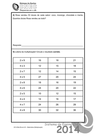 Este documento contém um conjunto de exercícios de multiplicação para alunos do 3o ano do ensino fundamental. Os exercícios incluem escrever multiplicações com resultado 12, calcular o número total de beterrabas plantadas em dois canteiros por Dona Lisa, e calcular a quantidade total de tecidos em três prateleiras.