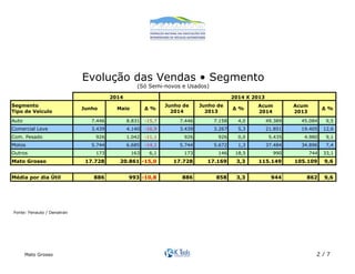 O documento apresenta estatísticas sobre as vendas de veículos usados e semi-novos no estado de Mato Grosso em junho de 2014. As vendas tiveram queda de 15% em relação a maio de 2014, mas aumento de 3,3% na comparação com junho de 2013. Os modelos mais vendidos foram Gol, Uno e Palio para automóveis, Strada, S10 e Saveiro para comerciais leves, e CG 125, CG150 e Biz para motocicletas.