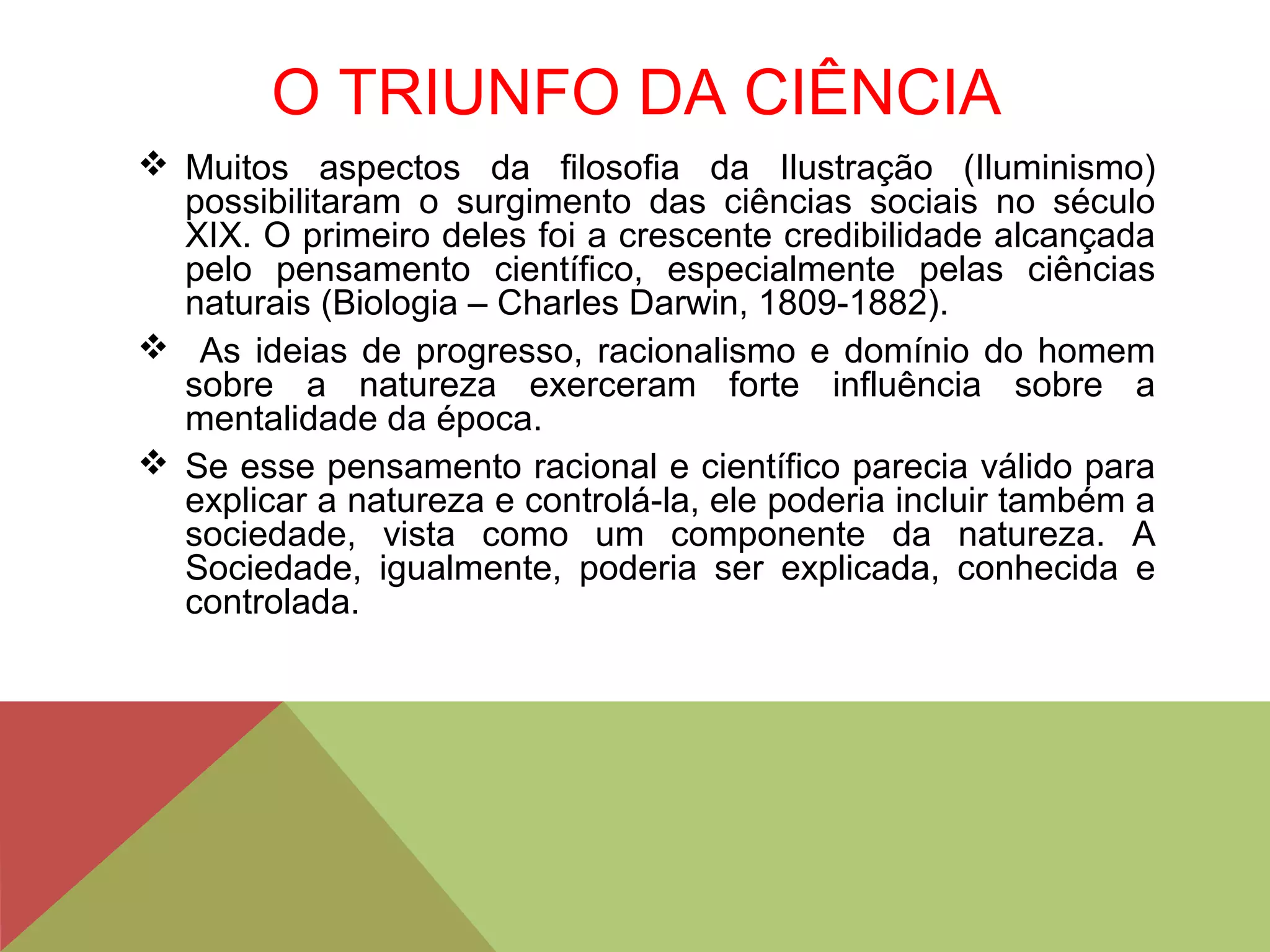 O documento discute os principais aspectos do positivismo de Auguste Comte. Comte propôs que a sociedade poderia ser estudada cientificamente e que seguiria leis naturais, assim como as ciências naturais. Ele também acreditava que a humanidade passava por estágios evolutivos de pensamento - teológico, metafísico e positivo.