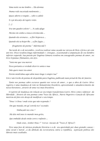 Castro Alves foi um poeta brasileiro nascido em 1847 que cantou o amor e a liberdade em seus poemas líricos e heroicos. Ele pregava a chegada de uma "era nova" e usou sua poesia para defender causas sociais como a abolição da escravatura. Considerado um dos primeiros abolicionistas, Castro Alves foi inspirado pelos princípios libertários de Victor Hugo e usou sua obra para denunciar o sistema econômico baseado na escravidão.
