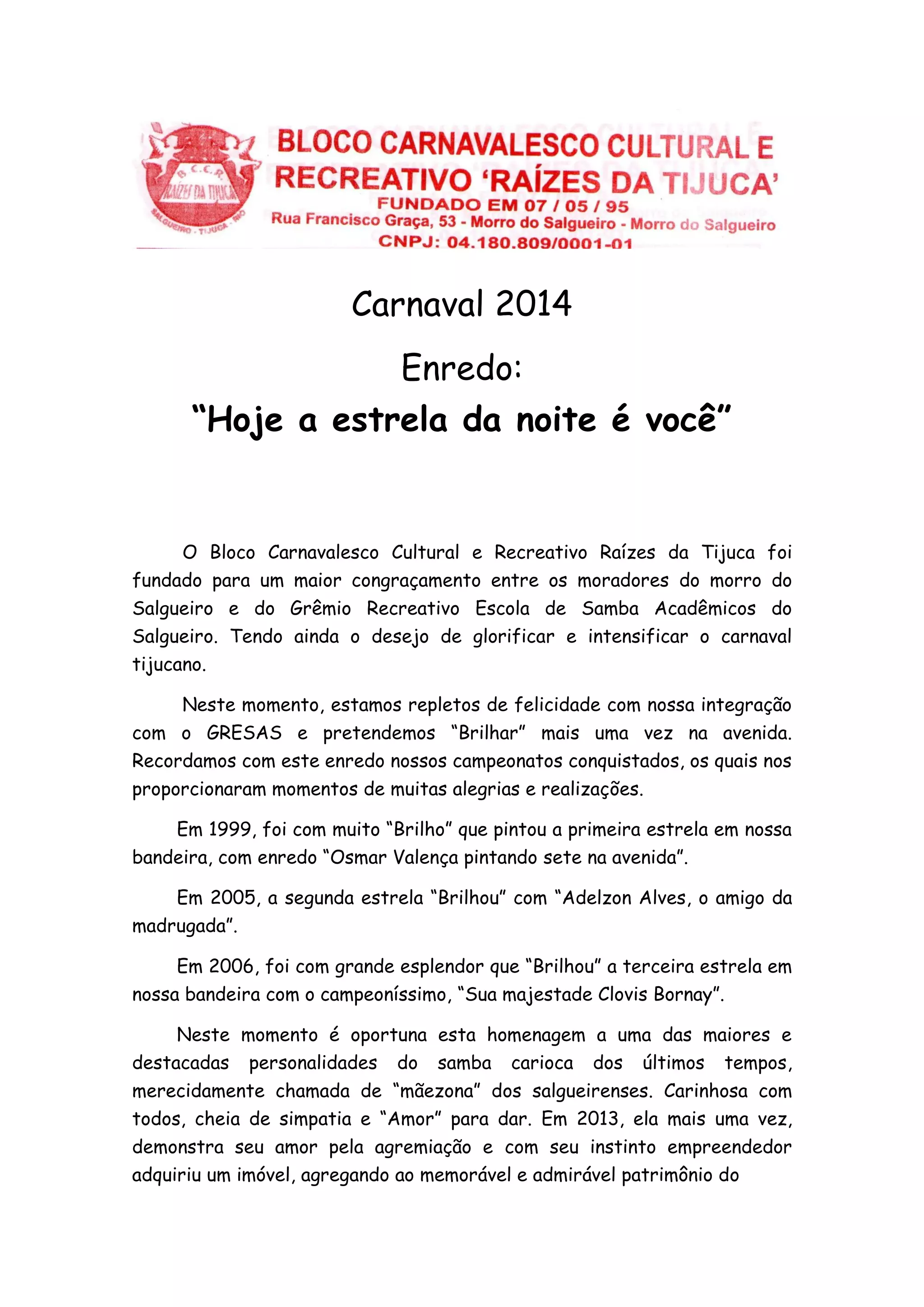 O Bloco Carnavalesco Cultural e Recreativo Raízes da Tijuca irá homenagear Regina Celi, uma das maiores personalidades do samba carioca, com o enredo "Hoje a estrela da noite é você". Regina Celi é conhecida como a "mãezona" dos salgueirenses e tem ajudado a manter o Grêmio Recreativo Escola de Samba Acadêmicos do Salgueiro sempre no auge, conquistando vários campeonatos para a escola.