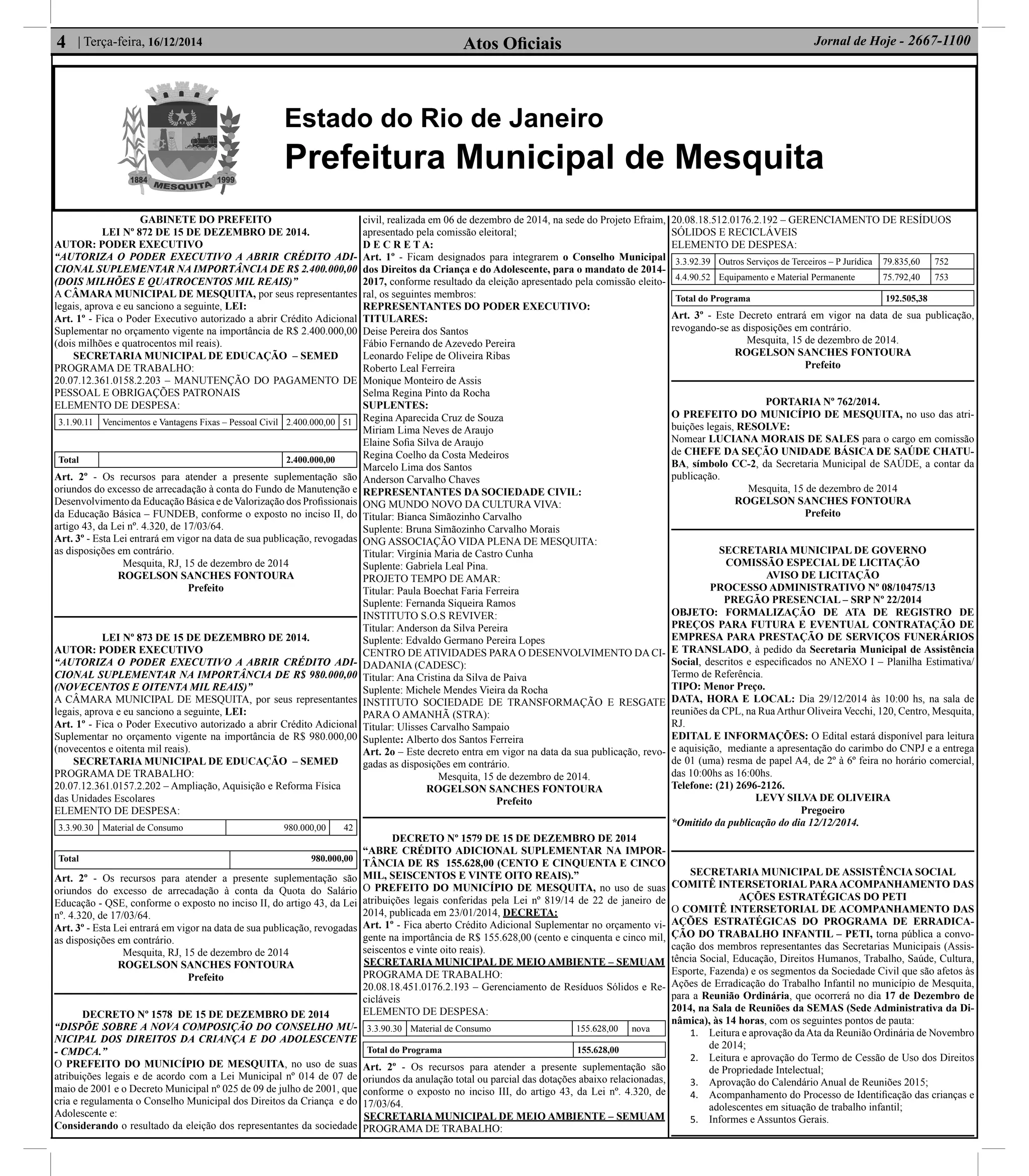A lei autoriza o poder executivo a abrir crédito adicional suplementar de R$2,4 milhões para pagamento de pessoal da Secretaria Municipal de Educação e de R$980 mil para material de consumo das escolas. O decreto define a nova composição do Conselho Municipal dos Direitos da Criança e do Adolescente.