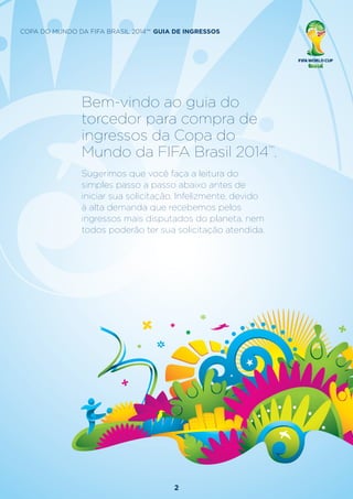O documento fornece informações sobre a compra de ingressos para a Copa do Mundo da FIFA de 2014 no Brasil, incluindo datas de venda, tipos de ingressos disponíveis e preços. Os ingressos serão vendidos em três fases com sorteios e por ordem de chegada no site da FIFA.