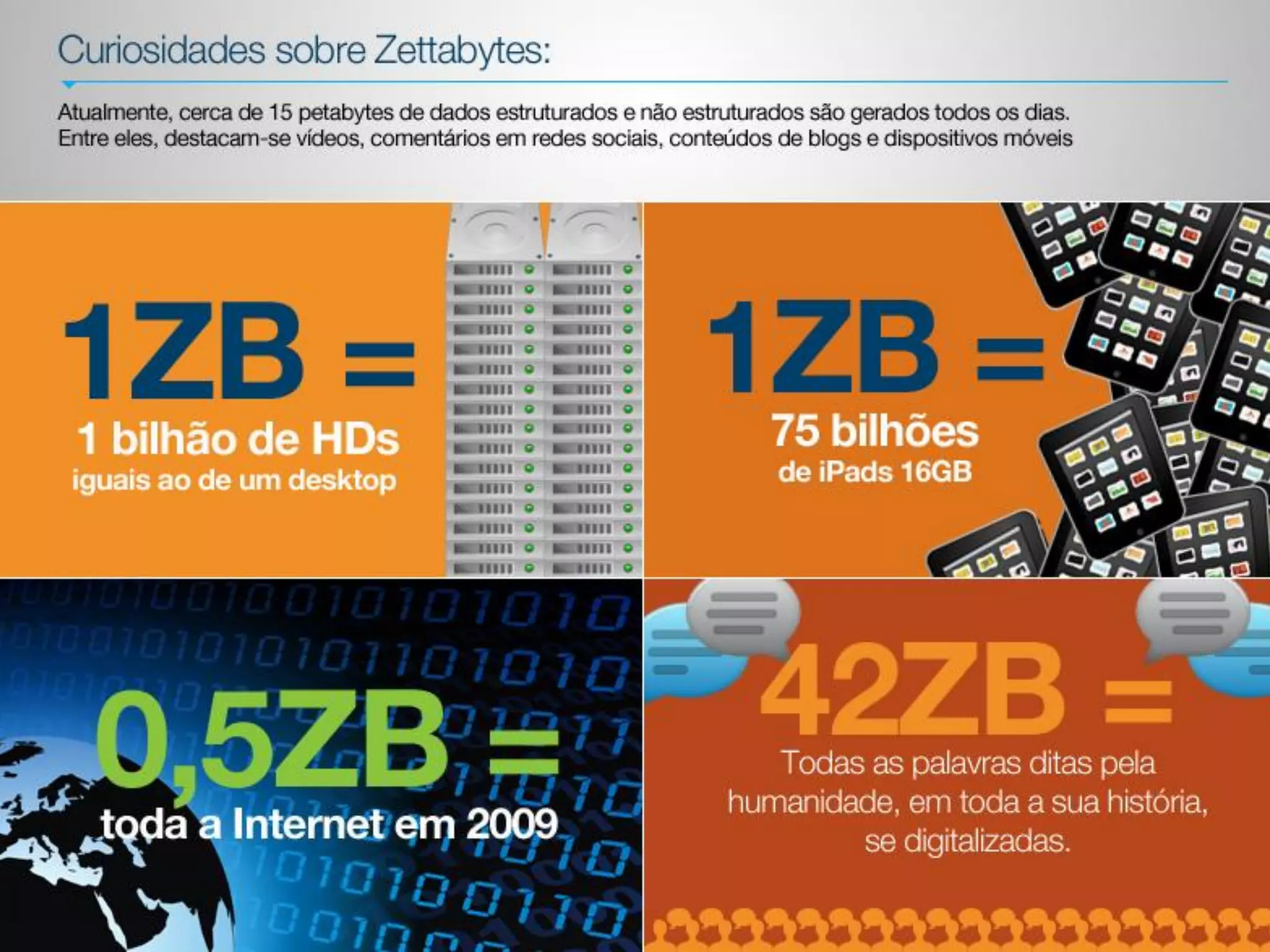 O documento discute o crescimento exponencial da geração e armazenamento de dados, especialmente dados não estruturados provenientes de dispositivos móveis e redes sociais. Também aborda como empresas têm utilizado análises de big data para melhorar seus negócios e entender os consumidores.