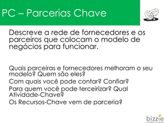 O documento descreve os principais pontos sobre parcerias-chave e estrutura de custos para modelos de negócios. As parcerias-chave podem ser formadas para otimização de recursos, redução de riscos e aquisição de ativos especializados. A estrutura de custos deve considerar os custos fixos e variáveis envolvidos nos recursos, atividades e parcerias necessárias para o modelo.